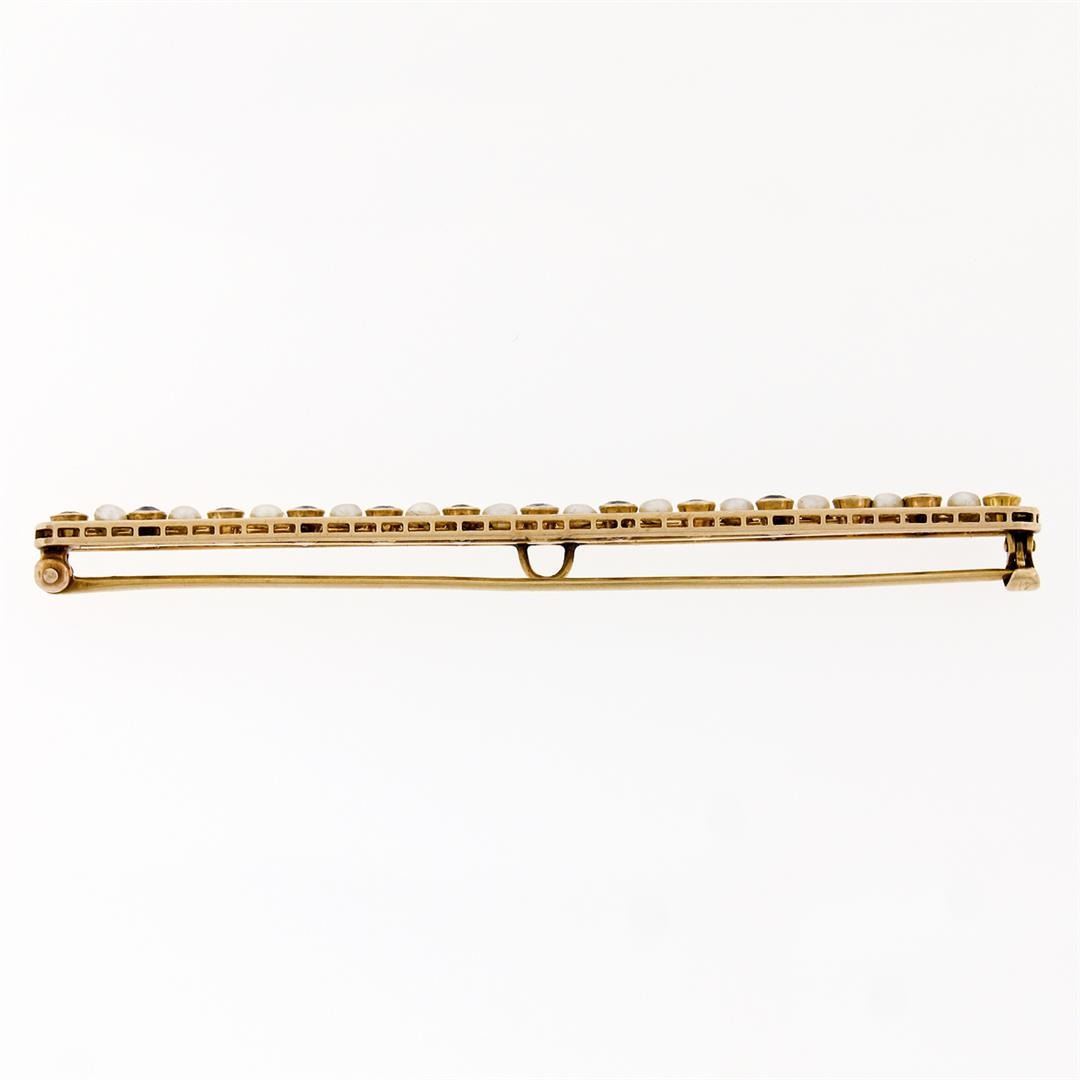 Antique Krementz 14k Gold 1.30ctw Old Sapphire Natural Pearl Long Bar Pin Brooch. Please see photos and description for all available information. An antique krementz solid 14k yellow gold bar pin brooch. featuring 13 old round cut natural sapphires (1.30ctw), alternated with 12 round cut natural pearls (2.6-2.8). Measures 4.9x79mm and weighs a total of 6.19 grams.
