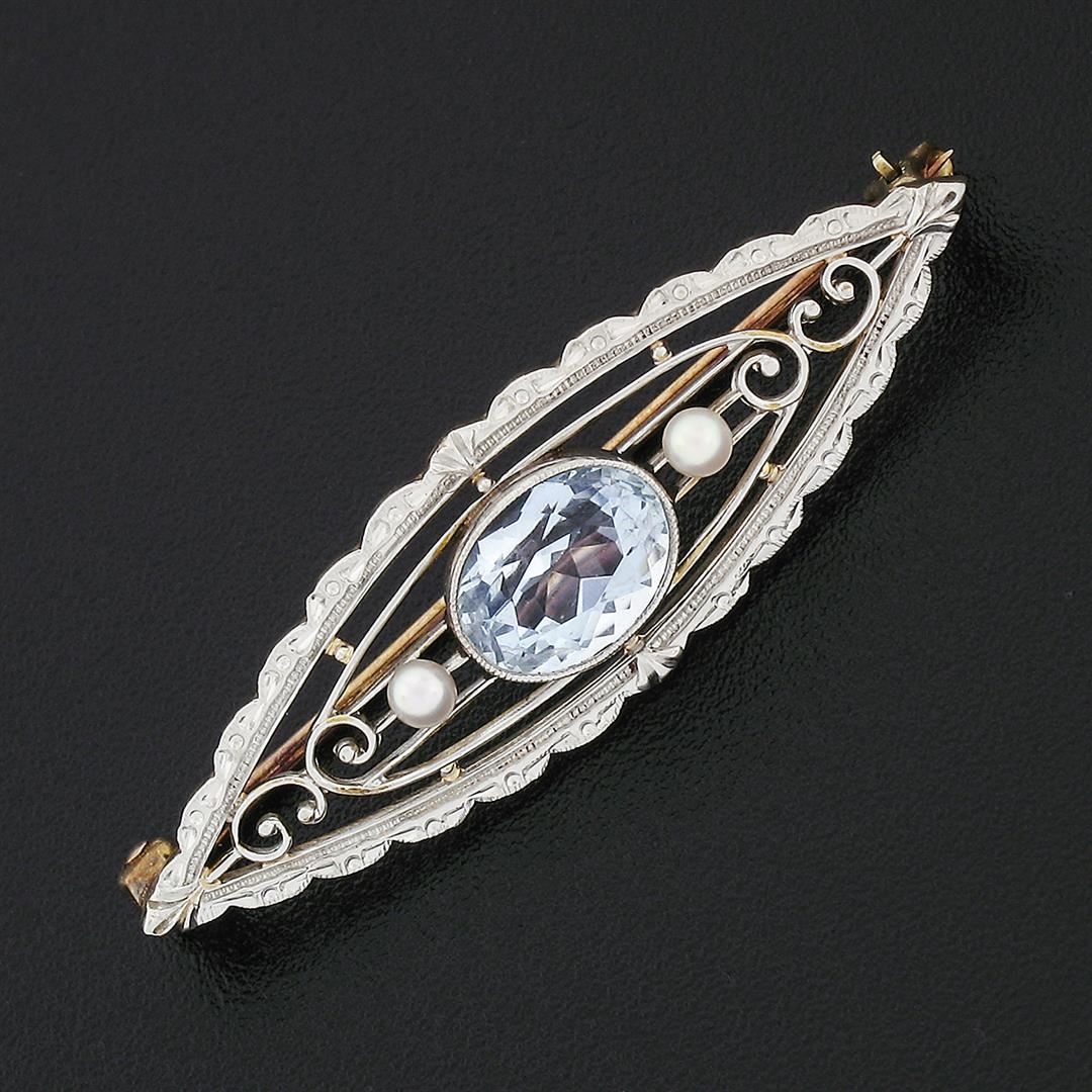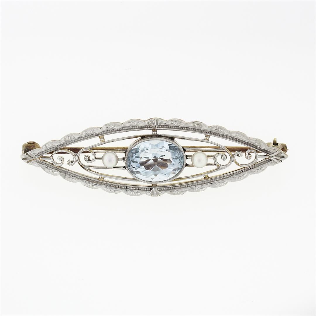 An antique art nouveau solid 14k yellow gold & platinum pin brooch by Krementz, with 1 oval cut natural aquamrine (8.2x6.1mm - 1.25ct), 2 round shape natural pearls (2.3mm). Measures 11.45x38.1mm and weighs a total of 3.03 grams.