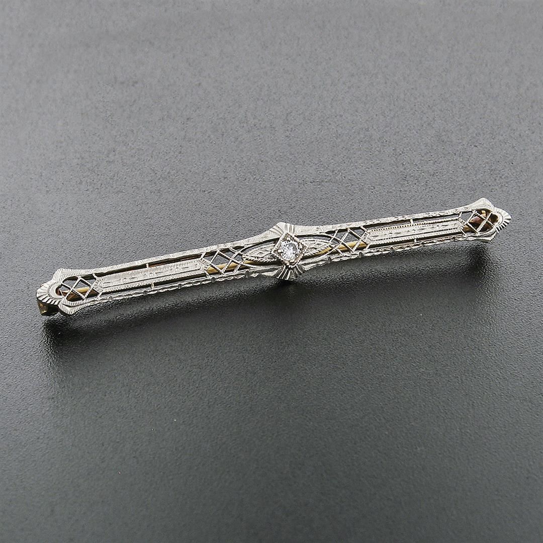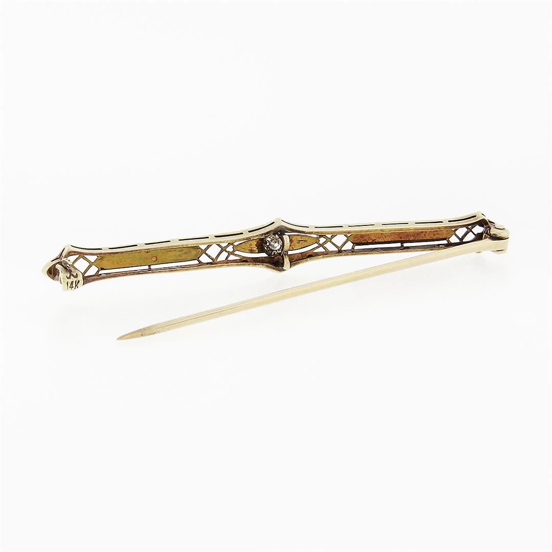 An antique solid 14k yellow gold and platinum pin brooch by Krementz, with 1 old european cut natural diamond (G - VS2 ; 0.06ctw). Measures 7.5x64.3mm and weighs a total of 4.42 grams.