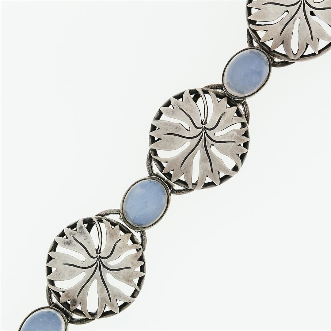 An antique solid silver foliage bracelet by Lauritz JensenIt, featuring 6 oval cabochon cut moonstones (7.50x9.25mm). weighs a total of 26.85 grams, measures 19.44mm wide, and measures 7.25 inches in length.