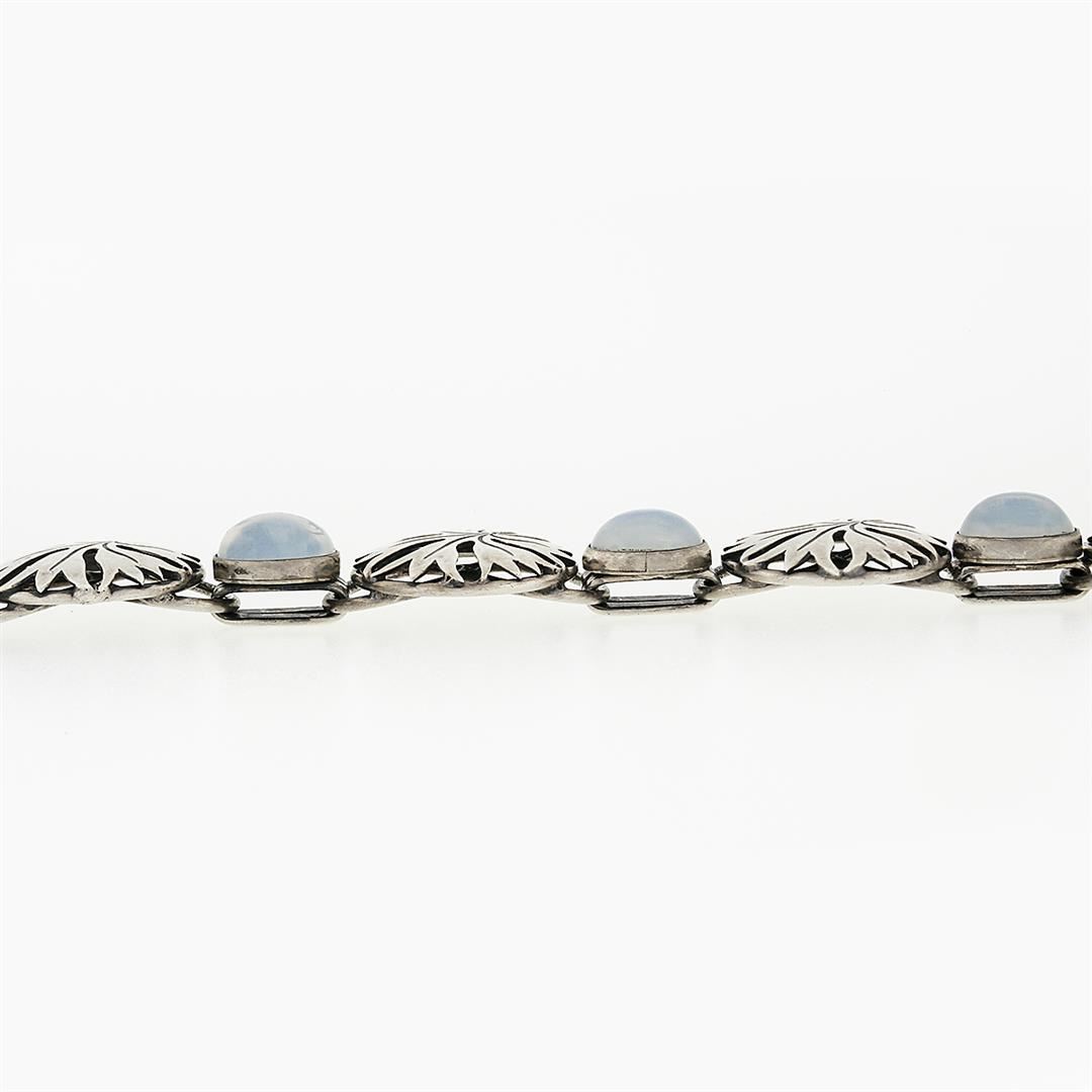 An antique solid silver foliage bracelet by Lauritz JensenIt, featuring 6 oval cabochon cut moonstones (7.50x9.25mm). weighs a total of 26.85 grams, measures 19.44mm wide, and measures 7.25 inches in length.