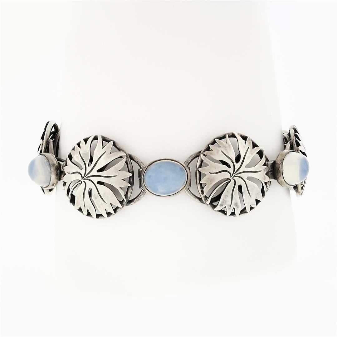 An antique solid silver foliage bracelet by Lauritz JensenIt, featuring 6 oval cabochon cut moonstones (7.50x9.25mm). weighs a total of 26.85 grams, measures 19.44mm wide, and measures 7.25 inches in length.