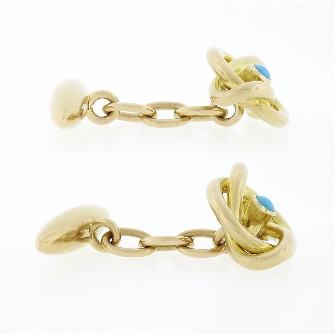 An antique art nouveau solid 18k yellow gold cufflinks, with 2 round cabochon cut natural turquoises (2.7mm ). These cuff links have a graduated tube on chain design with a clearance of 17.5mm, weigh a total of 8.96 grams, and the front panels measure 16.9x12.7mm.