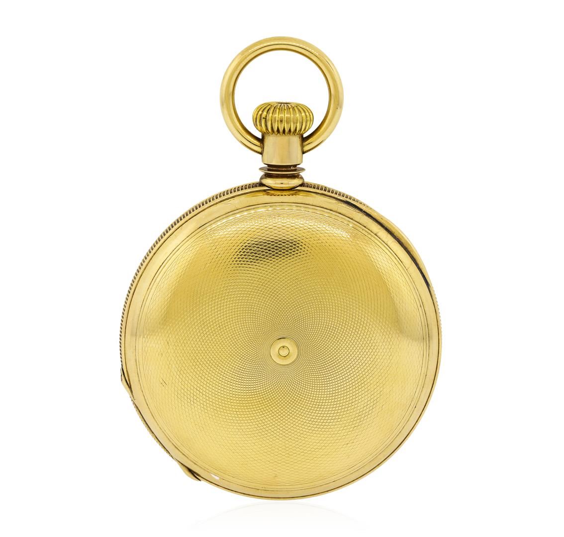 One New York Watch Co antique 18KT Yellow Gold Pocketwatch. Movement: Mechanical with manual winding, serial number 24309. Case: Hunter, 18KT Yellow Gold, measures 53mm in diameter, case number 8882. Case signed "18" and engraved "DAVID MARRIO presented by the employees of Westerman Iron Works sept 28th 1878 Sharon Pa". Dial: White enamel with painted Roman numerals and blued steel hands. Seconds sub-dial is located at 6 o'clock. Condition: G-4 FINE, (good working order and good condition). Total Weight of Watch: 126.20gm.