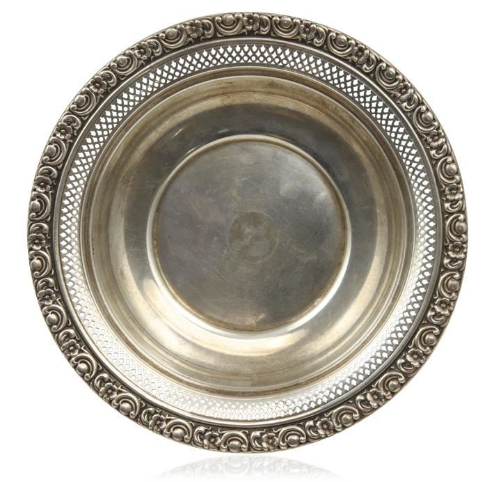 One Newport sterling silver bowl featuring: pierced design, lovey art nouveau rim and measures 6" wide by 1" tall.