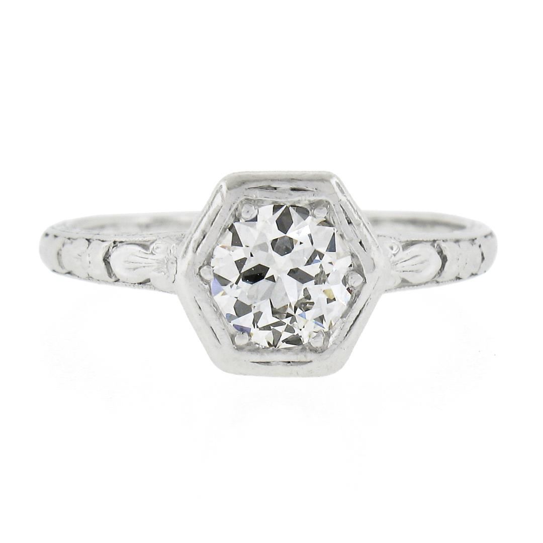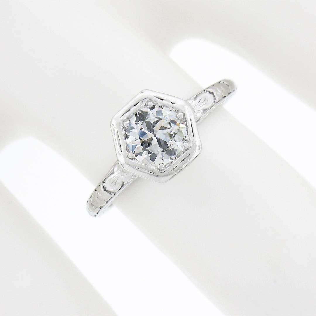 An antique solid platinum engagement ring by Orange Blossom, with 1 old european cut natural diamond (G - VS1 ; 0.60ctw). The ring is size 4.5, weighs a total of 3.33 grams, and measures 7.8mm wide.