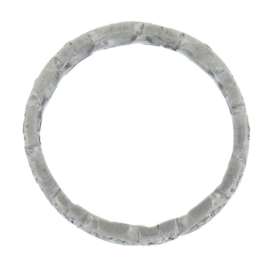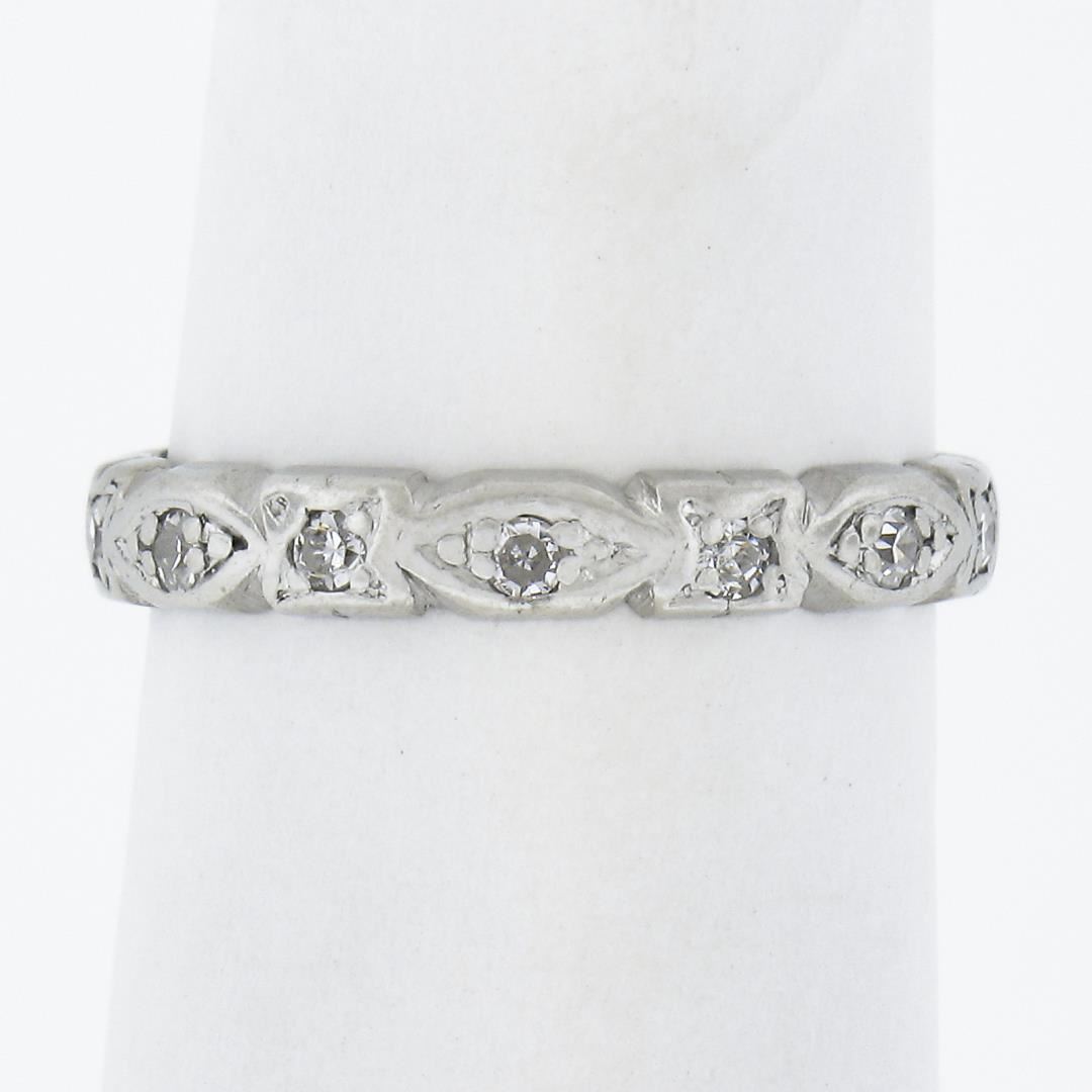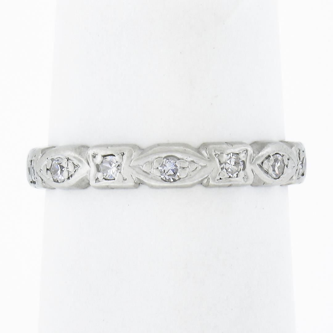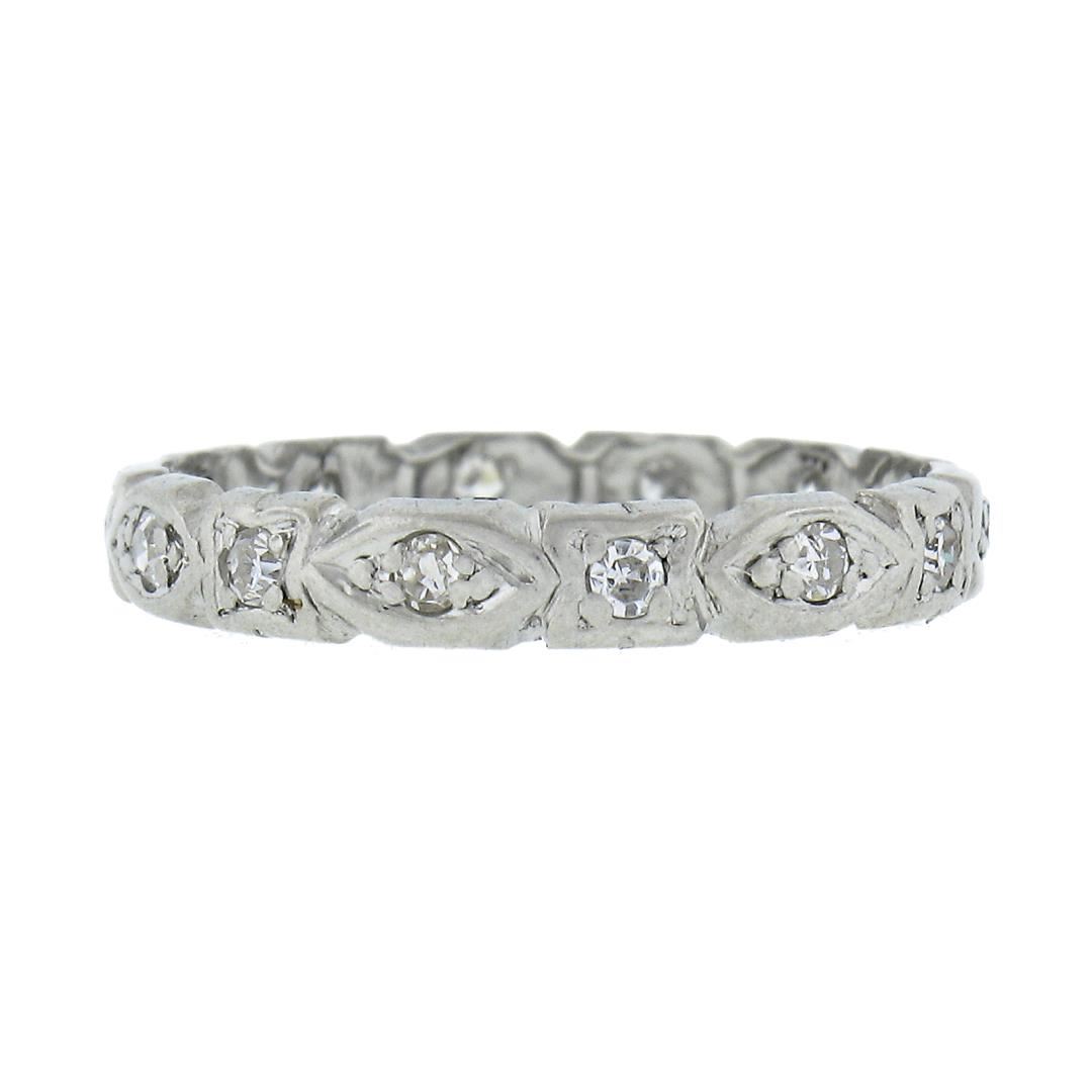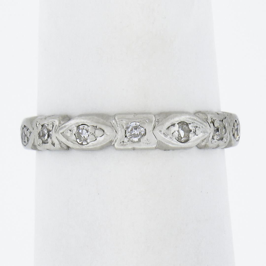 An antique solid platinum eternity band ring, featutring 14 old single cut natural diamonds (G/I - VS2-SI2 ; 0.15ctw). The ring is size 5.0, weighs a total of 2.21 grams, and measures 3mm wide.