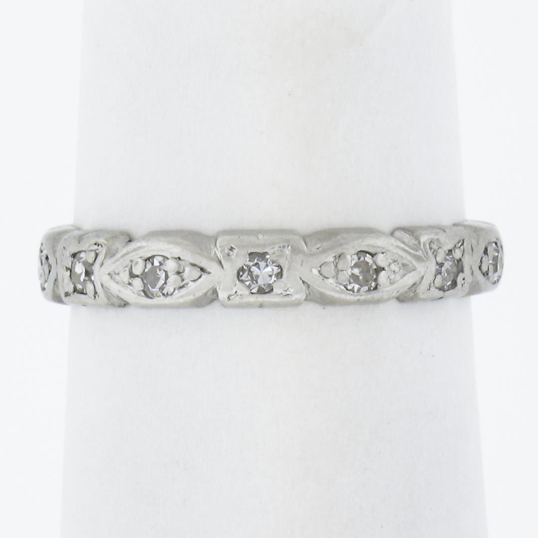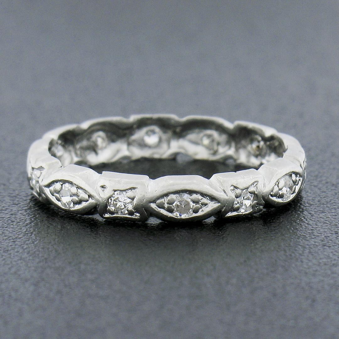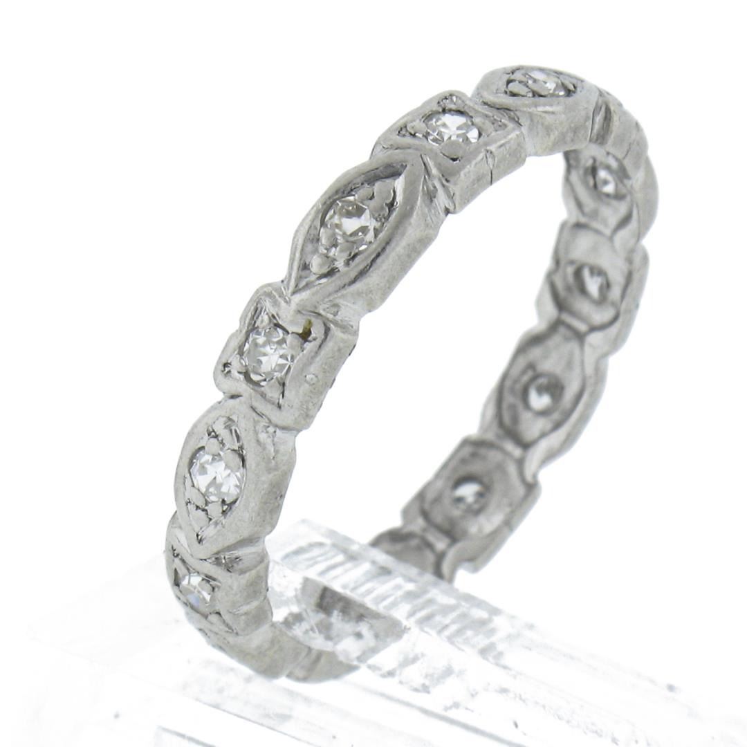 An antique solid platinum eternity band ring, featutring 14 old single cut natural diamonds (G/I - VS2-SI2 ; 0.15ctw). The ring is size 5.0, weighs a total of 2.21 grams, and measures 3mm wide.