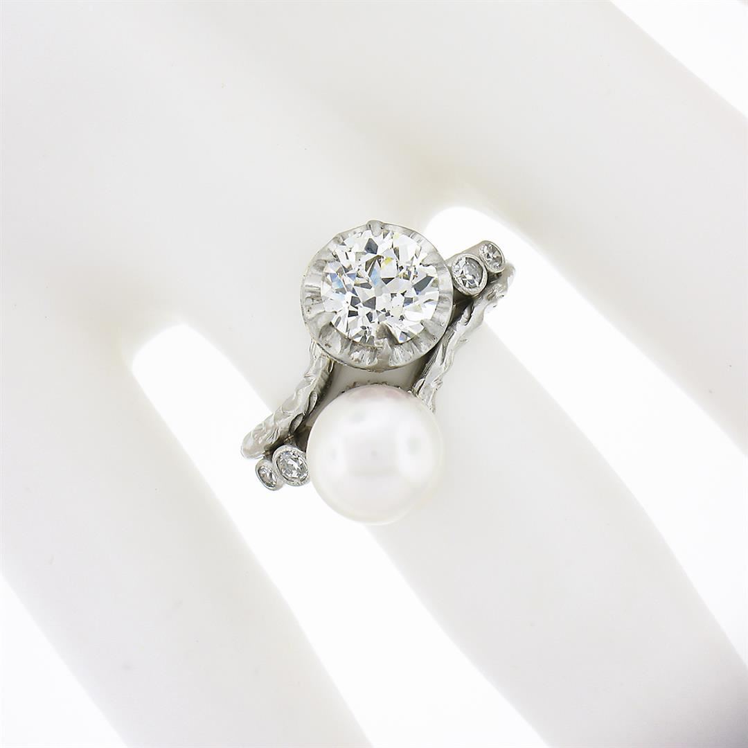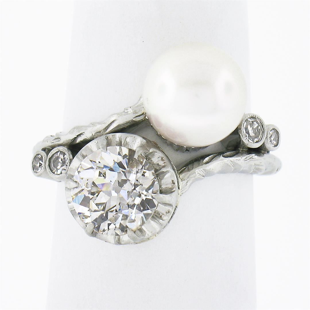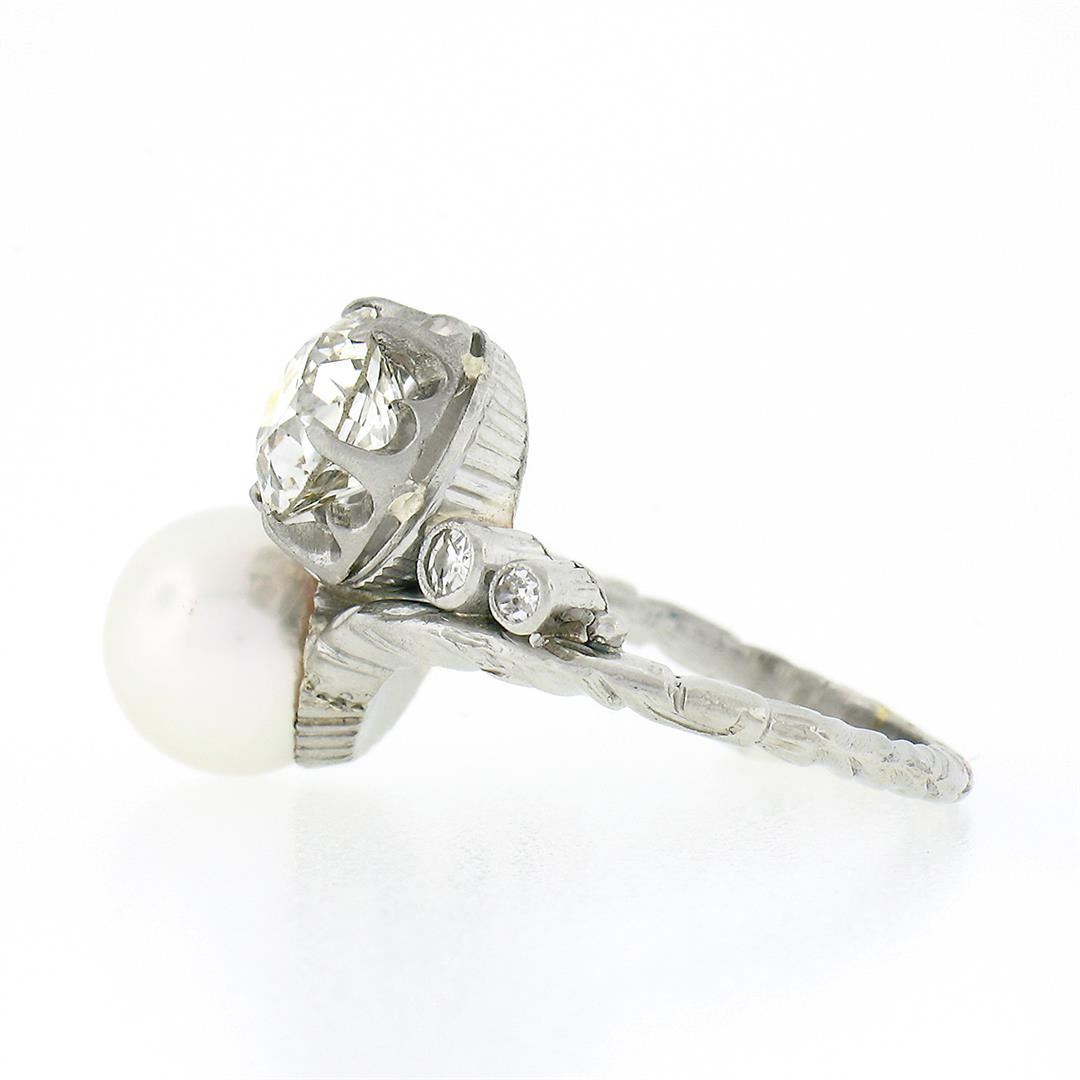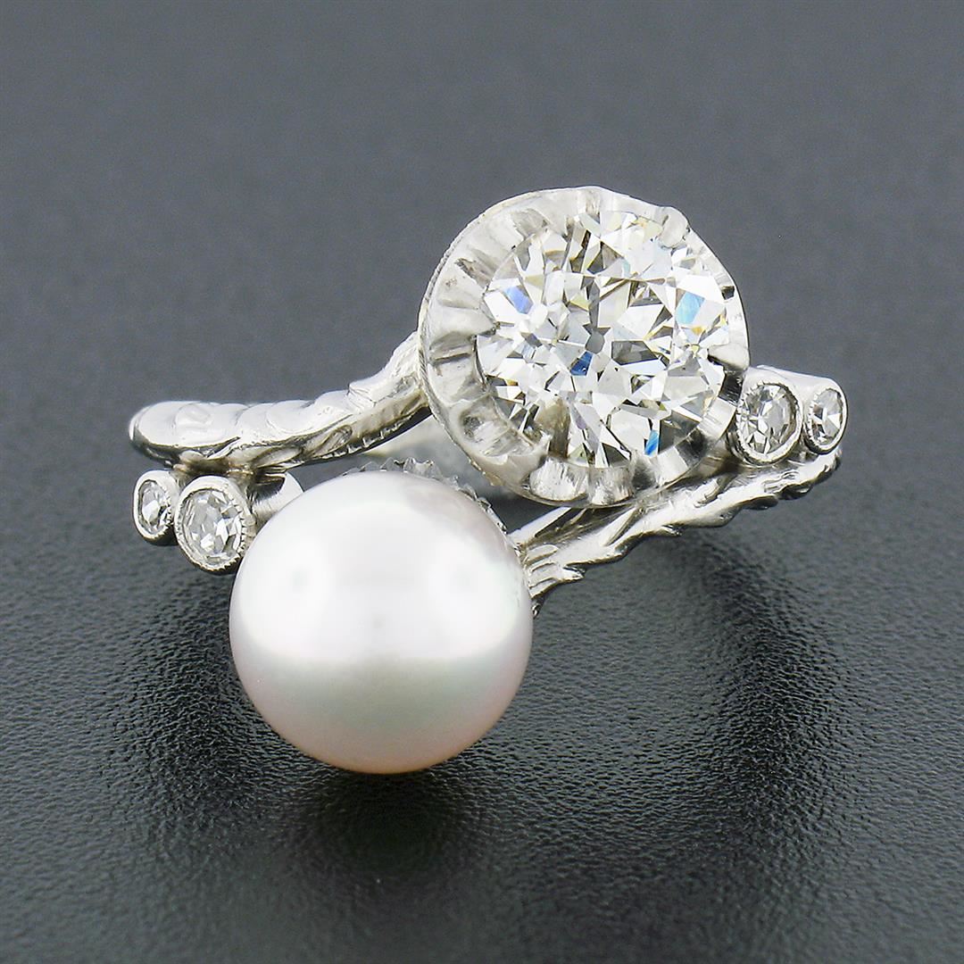 An antique solid platinum bypass ring, with 1 Gia certified old European cut natural diamond (J - I1 ; 1.36c), and 1 round shape cultured pearl (8.20mm), accented with 4 old single cut natural diamonds (G/H - VS1/VS2 ; 0.14ctw). The ring is size 5.0, weighs a total of 6.80 grams, and measures 15.30mm wide. Comes with all original relevant certifications.