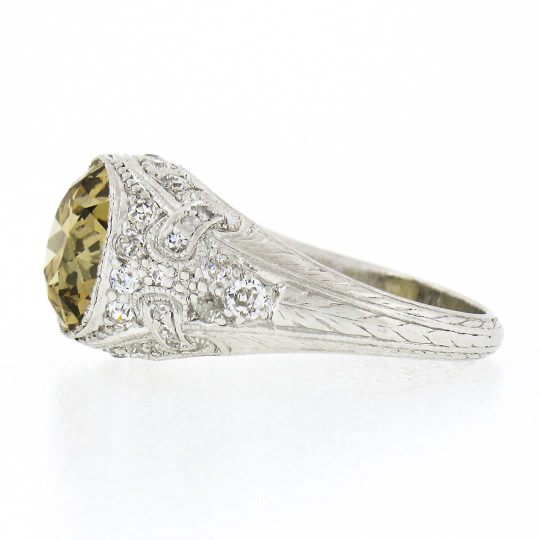 An antique solid platinum ring, with 1 GIA graded old european cut fancy brownish yellow natural diamond (VS2 Clarity - 2.24ct), and 36 old european cut natural diamonds (G/H - VS2/SI1 ; 0.40ctw). The ring is size 4.0, weighs a total of 5.85 grams, and measures 9.40mm wide. Comes with all original relevant certifications.