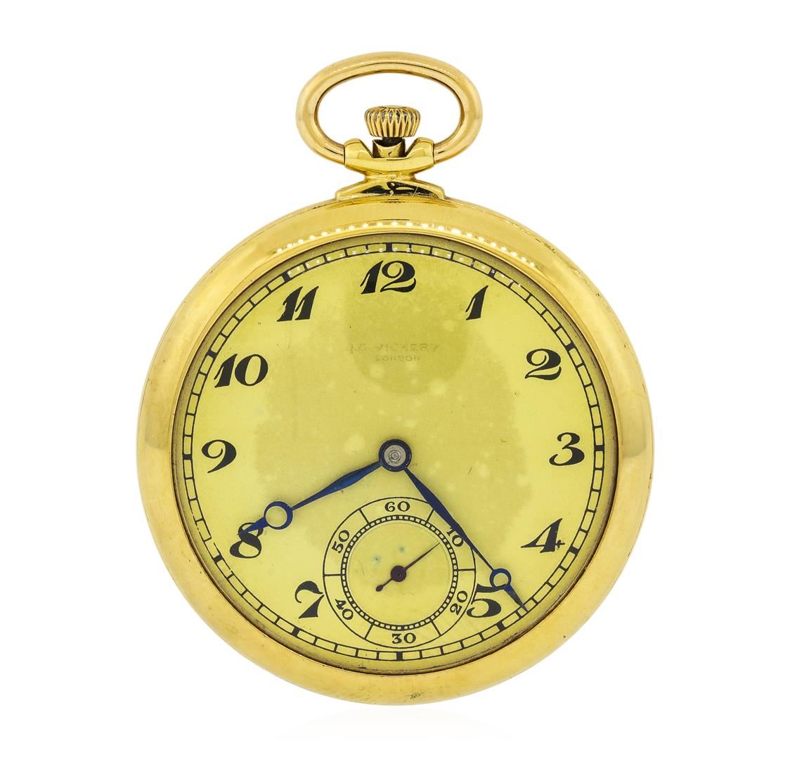 One antique 18KT Yellow Gold open-face pocketwatch. Movement: Mechanical with manual winding. Case: Open-Face, 18KT Yellow Gold, measures 42mm in diameter, case number 301271. Case signed "18 .75 GS". Dial: Ivory enamel with painted Arabic numerals and blued steel hands. Seconds sub-dial is located at 6 o'clock. Condition: G-4 FINE, (good working order and good condition). Total Weight of Watch: 49.10gm.