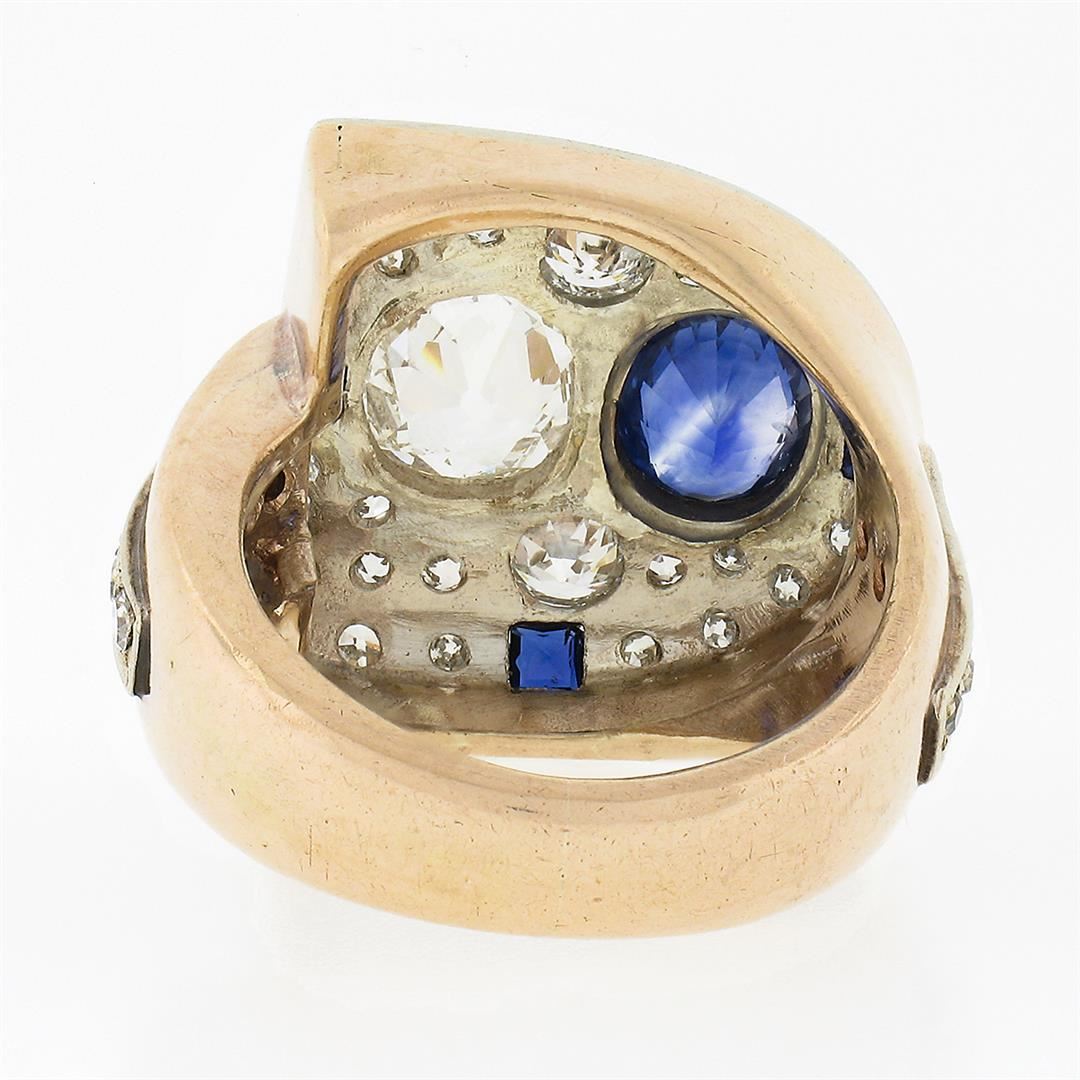 An antique solid 14k rose and white gold ring, with 1 gia certified cushion cut natural diamond (1.09ct ), and 1 oval cut natural sapphire (1.04ct), with 4 square French cut natural sapphires (0.32ctw)), and 42 old cut natural diamonds (H/I - VS1-SI1 ; 1.20ctw). The ring is size 6.5, weighs a total of 11.94 grams, and measures 19.25mm wide. Comes with all original relevant certifications.