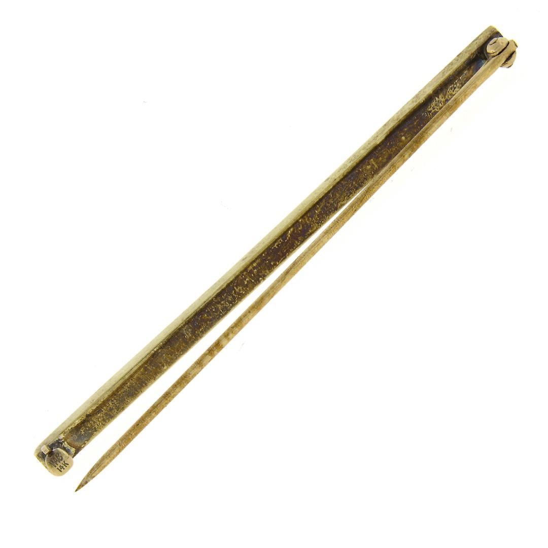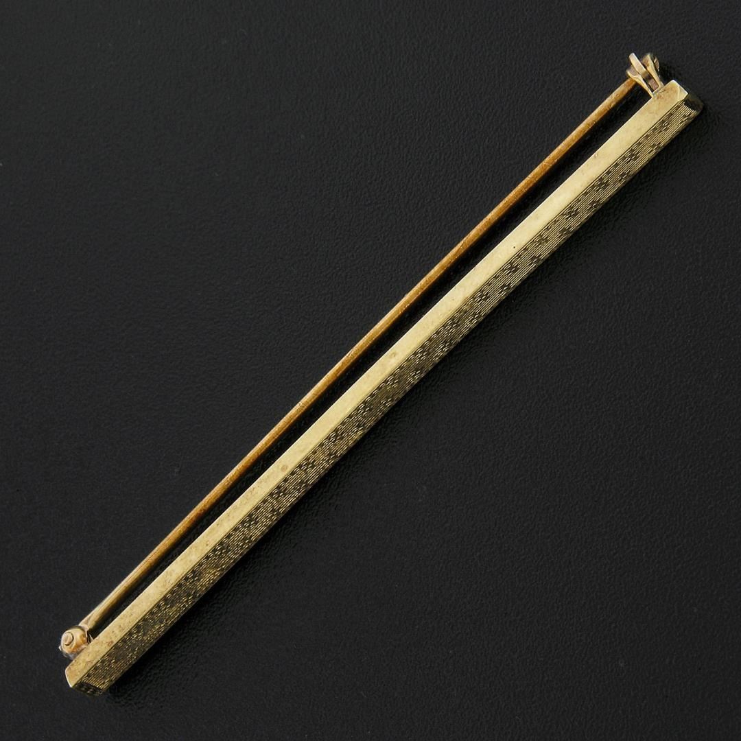 An antique solid 14k yellow gold bar pin brooch. Measures 63.4x3.1mm and weighs a total of 2.65 grams.