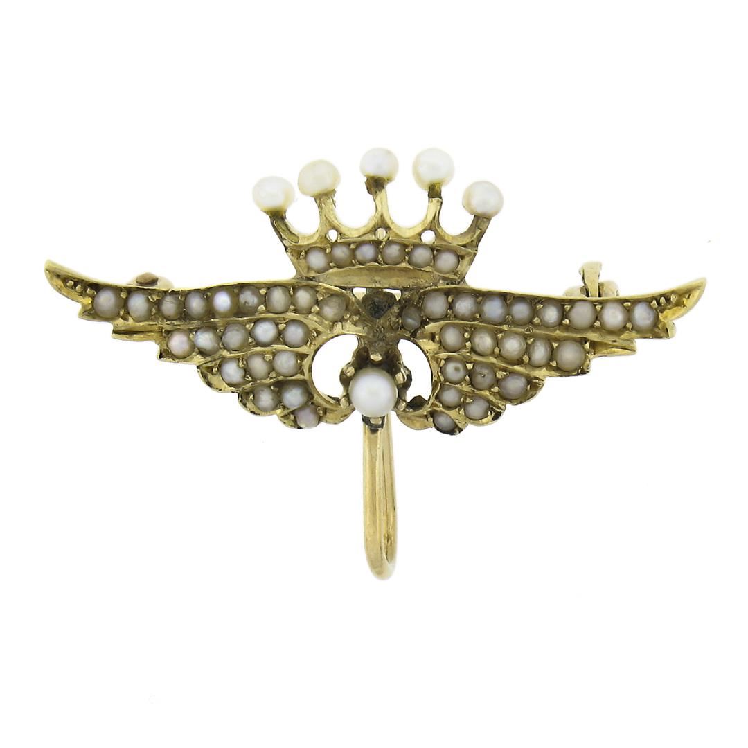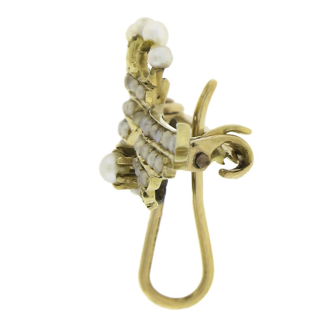 An antique solid 14k yellow gold brooch watch hook, with round seed pearls (0.7-2.1mm). Measures 21x29.7mm and weighs a total of 2.21 grams.