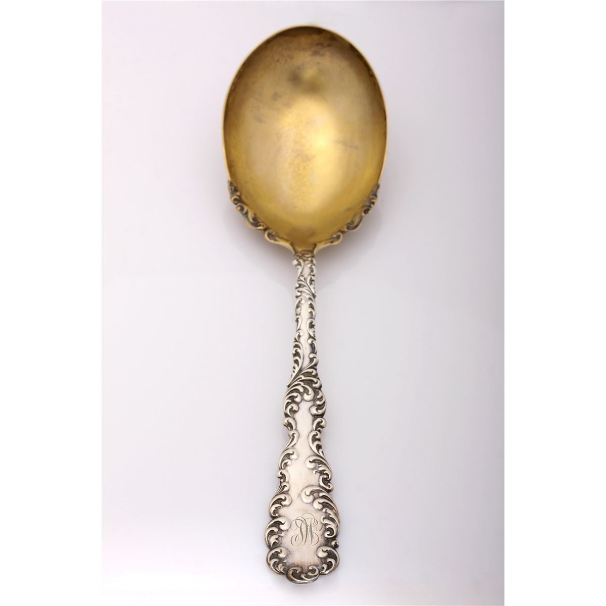 One antique sterling silver "Waverly" gold wash spoon by Wallace circa 1890. Excellent estate condition with no dings or problems with the spoon, monogrammed in beautiful interlocking period script.