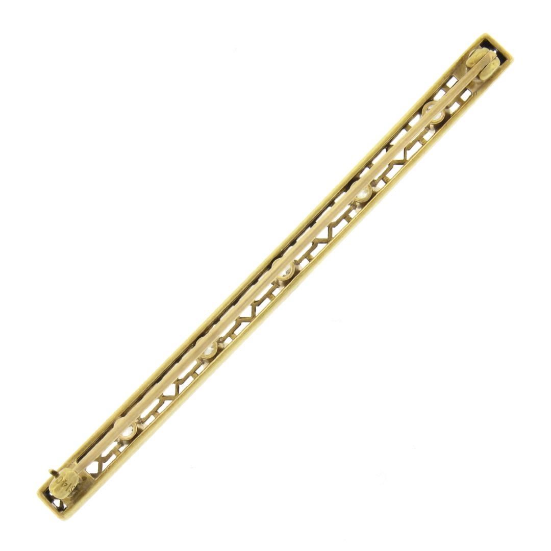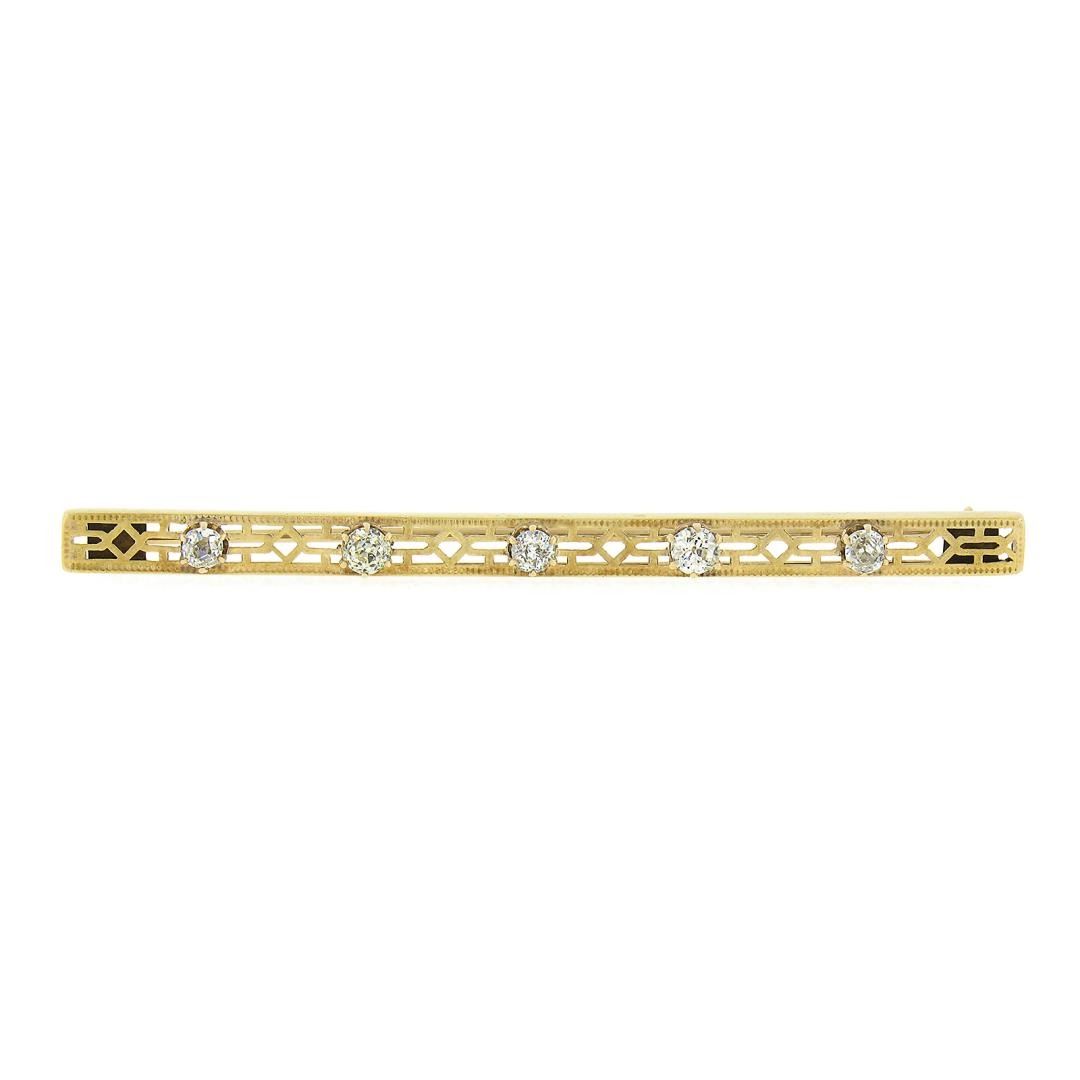 An antique solid 14k yellow gold bar brooch by Strobel & Crane, with 5 old European & old single cut natural diamonds (H-J - VS2-SI2 ; 0.60ctw). Measures 4.2x63mm and weighs a total of 4.14 grams.
