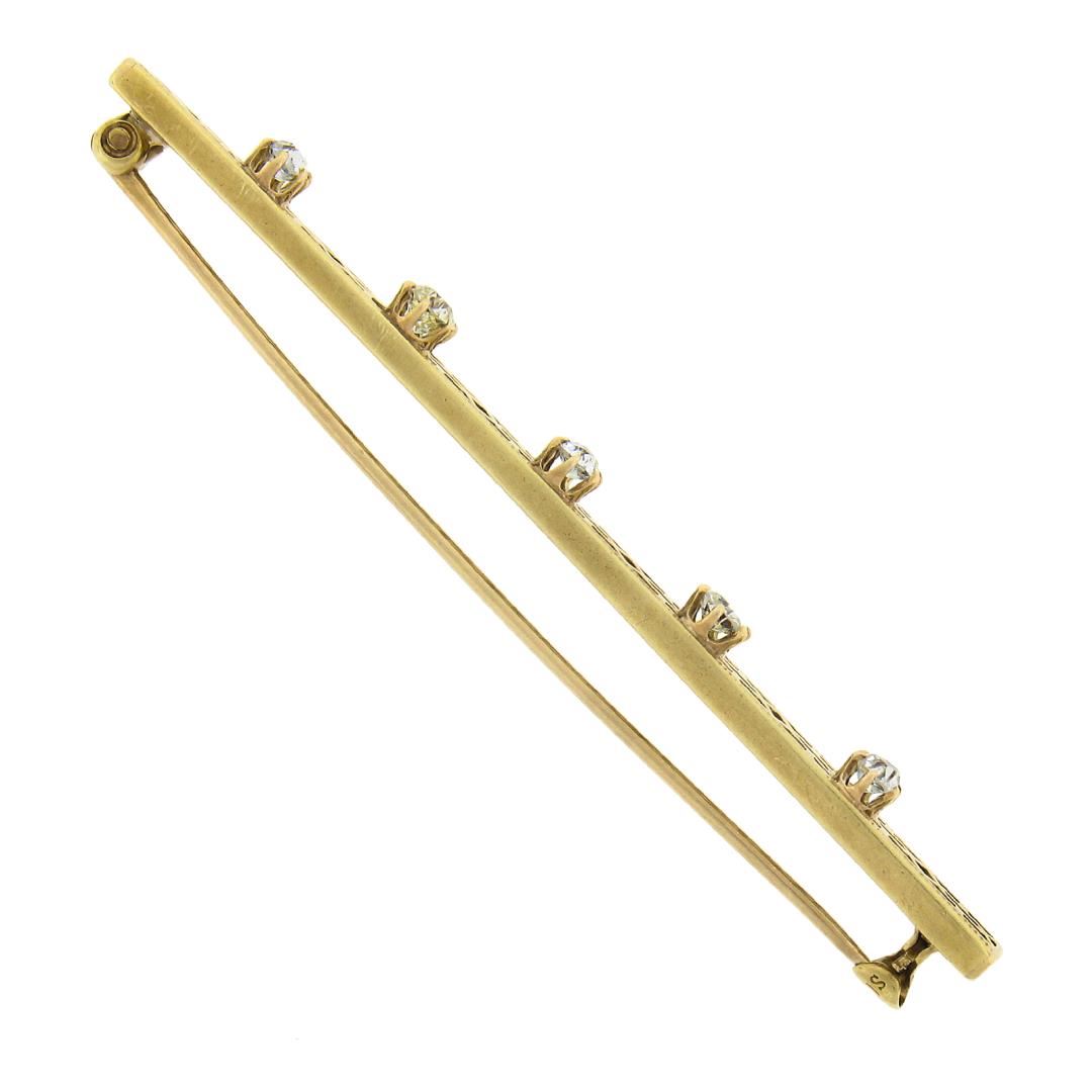 An antique solid 14k yellow gold bar brooch by Strobel & Crane, with 5 old European & old single cut natural diamonds (H-J - VS2-SI2 ; 0.60ctw). Measures 4.2x63mm and weighs a total of 4.14 grams.