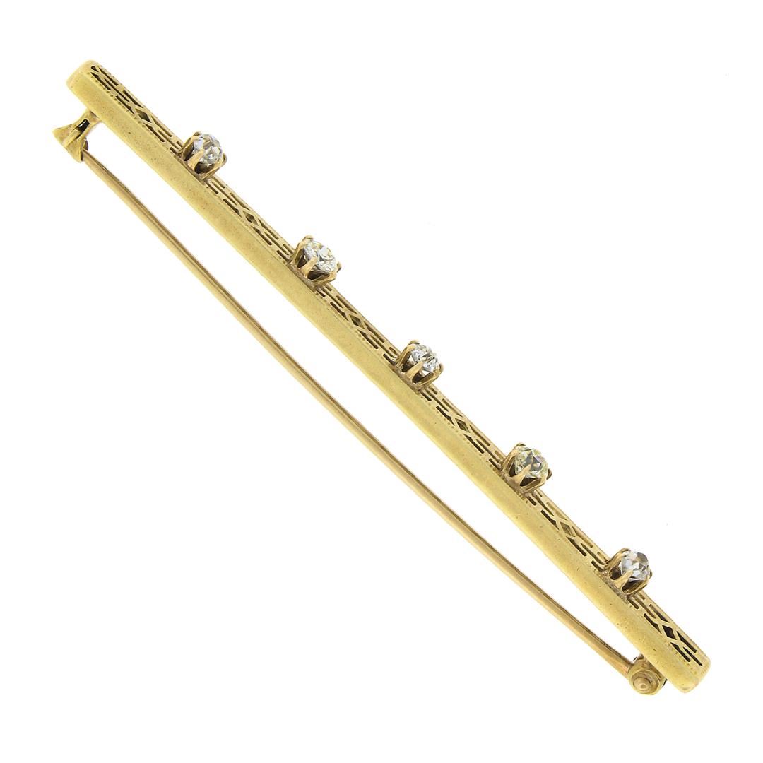 An antique solid 14k yellow gold bar brooch by Strobel & Crane, with 5 old European & old single cut natural diamonds (H-J - VS2-SI2 ; 0.60ctw). Measures 4.2x63mm and weighs a total of 4.14 grams.