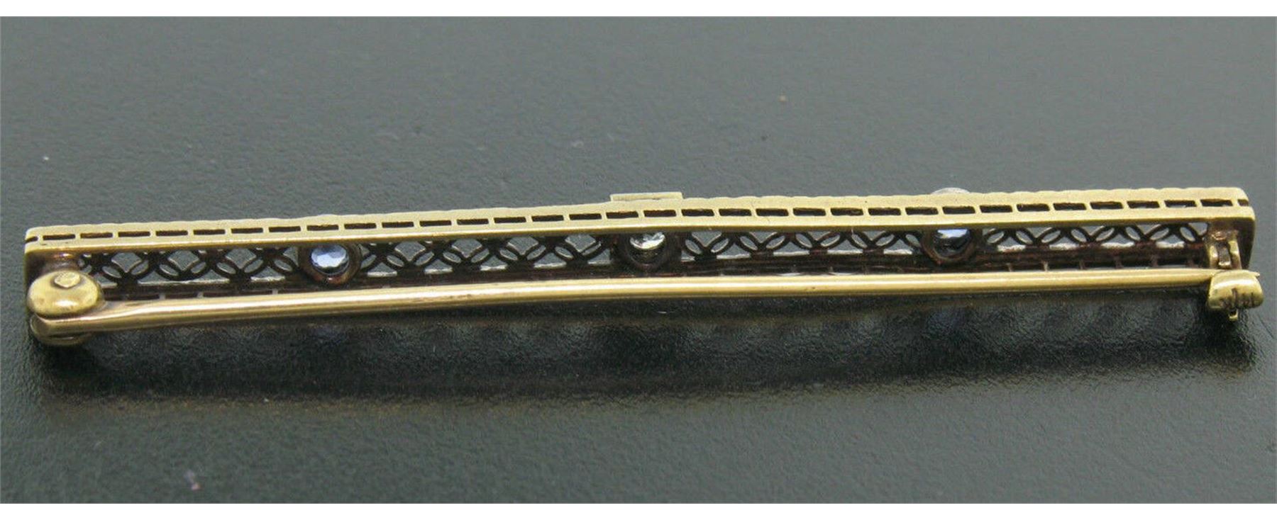An antique 14k yellow and white gold filigree bar pin featuring a center old European cut diamond (G - VS2; 0.05ct) flanked by 2 round synthetic blue sapphires. Measures 56.58x3.82mm and weighs a total of 3.20 grams.