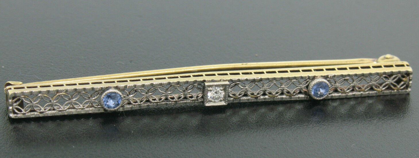 An antique 14k yellow and white gold filigree bar pin featuring a center old European cut diamond (G - VS2; 0.05ct) flanked by 2 round synthetic blue sapphires. Measures 56.58x3.82mm and weighs a total of 3.20 grams.