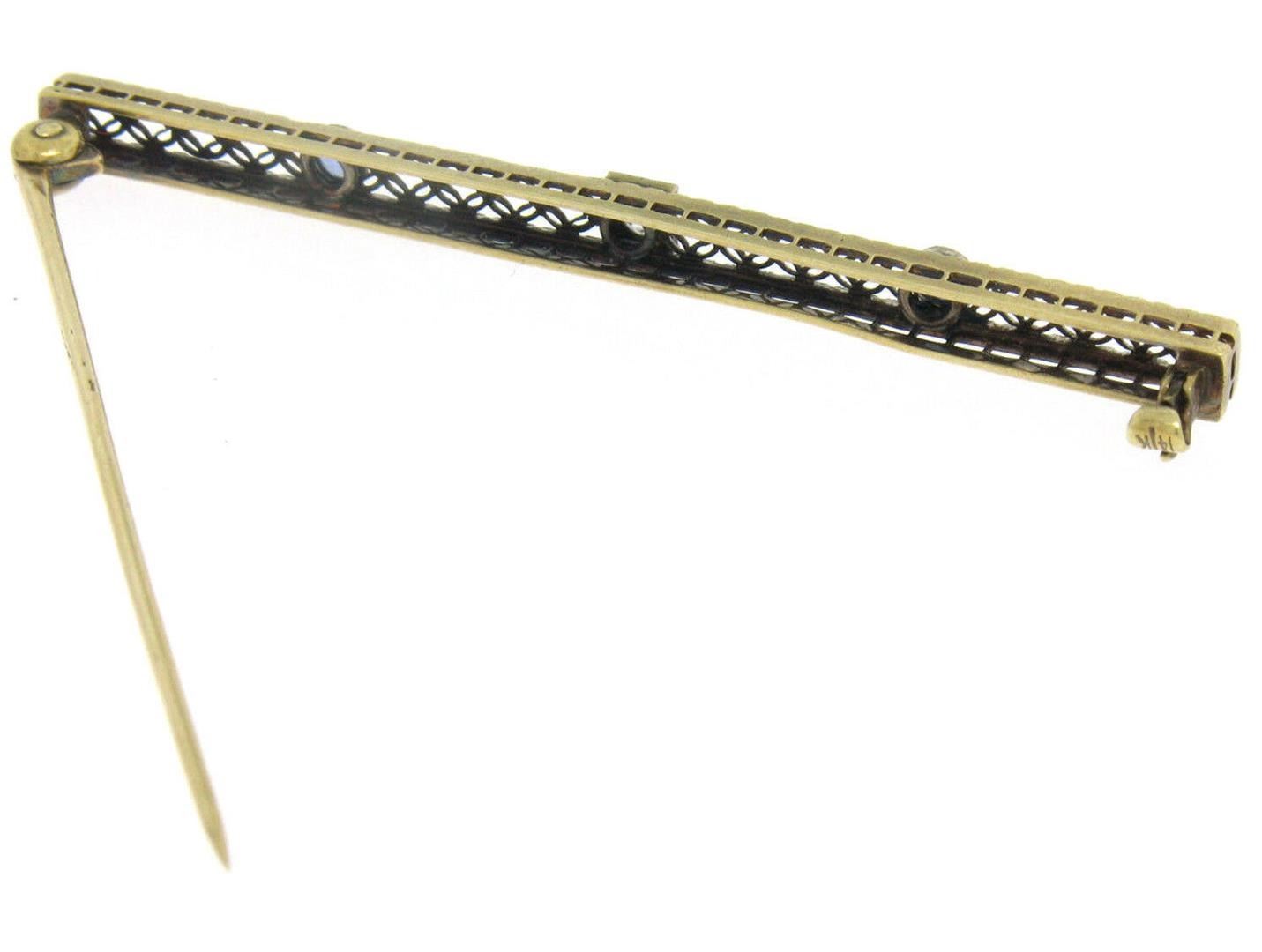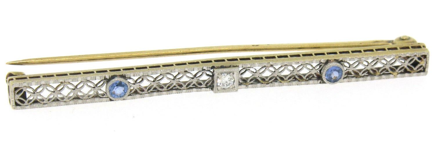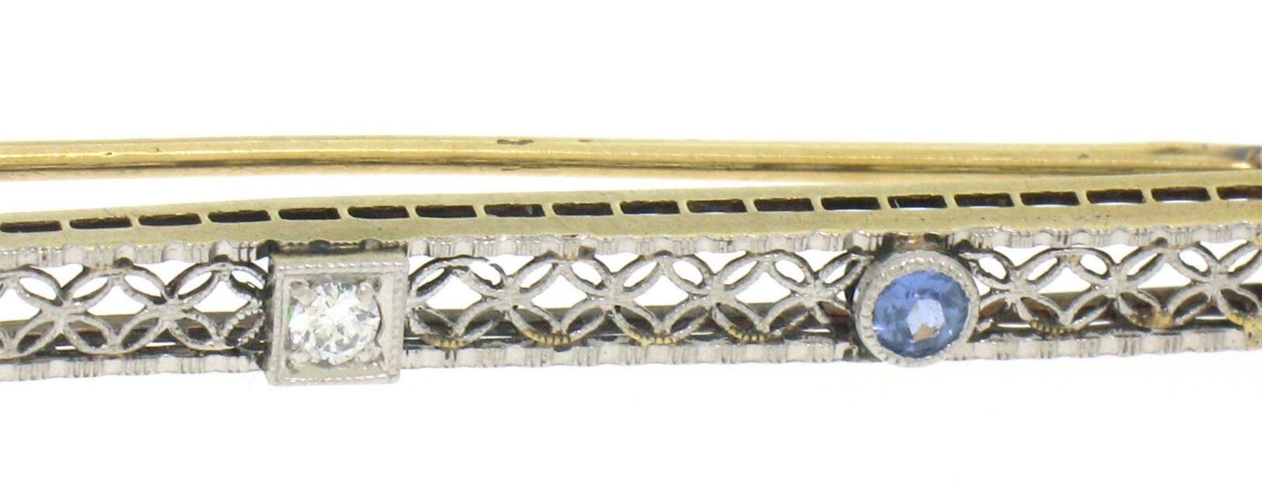 An antique 14k yellow and white gold filigree bar pin featuring a center old European cut diamond (G - VS2; 0.05ct) flanked by 2 round synthetic blue sapphires. Measures 56.58x3.82mm and weighs a total of 3.20 grams.