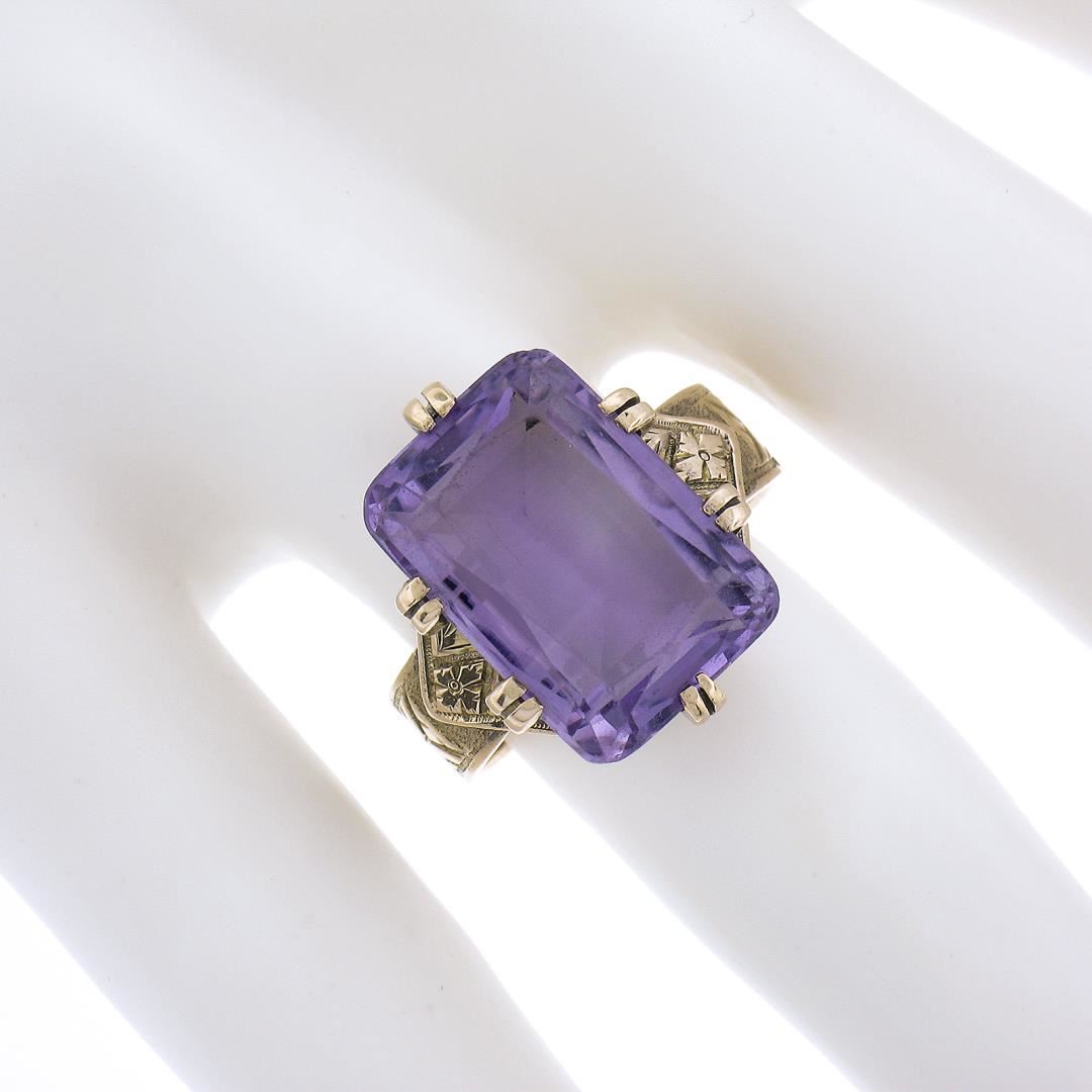Antique Victorian 10K Gold Rectangular Cut Amethyst Solitaire Engraved Ring