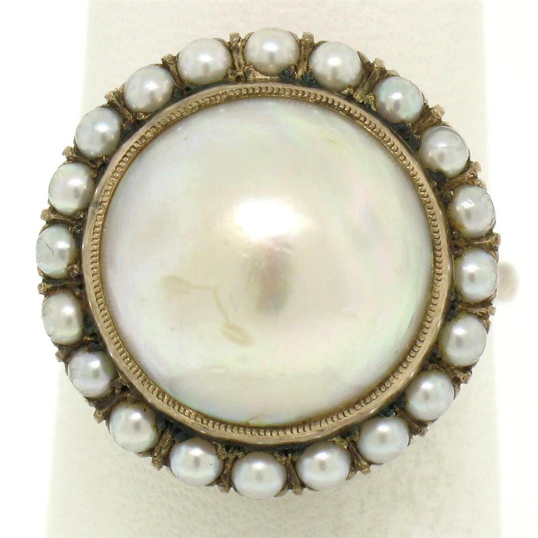 An antique victorian solid 10k rose gold set of earrings and ring, featuring 3 round natural mabe pearls (13.0mm ) with a halo of 60 natural seed pearls (2.0mm). The earrings measure approximately 11.56x17.40mm and weigh a total of 18.3 grams. The ring is size 6.25, measures 17.40mm wide.