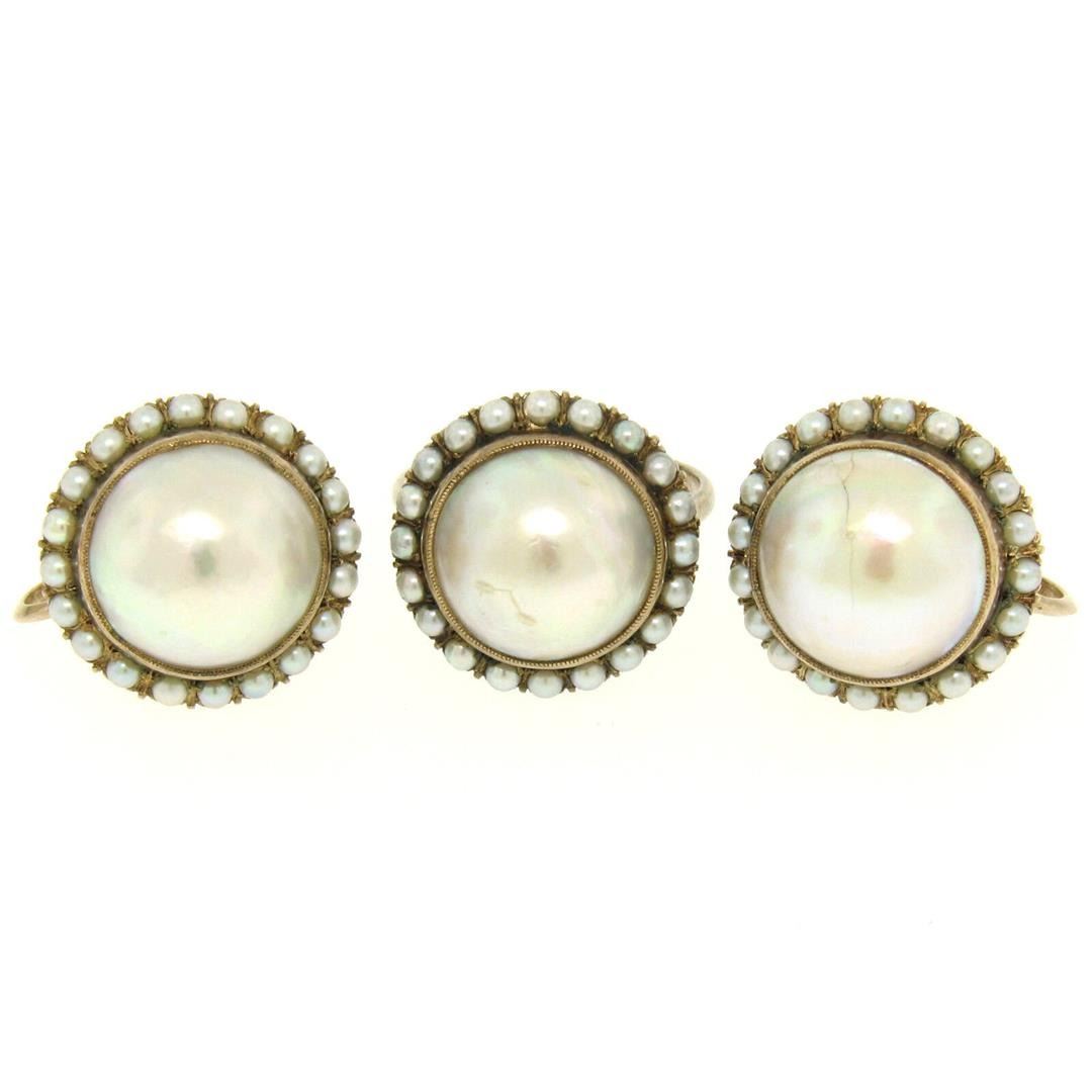 An antique victorian solid 10k rose gold set of earrings and ring, featuring 3 round natural mabe pearls (13.0mm ) with a halo of 60 natural seed pearls (2.0mm). The earrings measure approximately 11.56x17.40mm and weigh a total of 18.3 grams. The ring is size 6.25, measures 17.40mm wide.