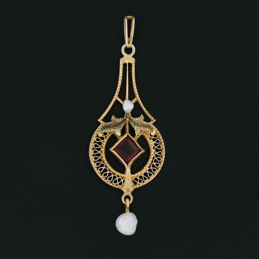 An antique solid 10k yellow & white gold lavelier pendant, with 1 square cut red stone ( 5.2x5.2mm ), 1 seed pearl (2x2.5mm), and 1 cultured pearl (4.1x3.6mm). The pendant weighs a total of 1.0 grams, measures 38.8x13.7mm including the bail, and the inside of the bail measures 4.2x2.2mm.