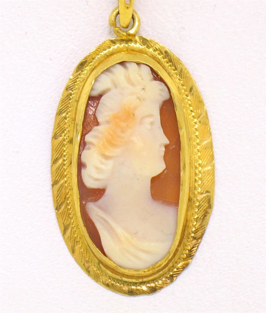 An antique victorian solid 10k yellow gold pendant necklace, with 1 oval cut natural carved shell cameo (18.35x9.43mm). The pendant weighs a total of 2.9 grams, measures 23.60x13.31mm including the bail, and 16 inch cable link chain.