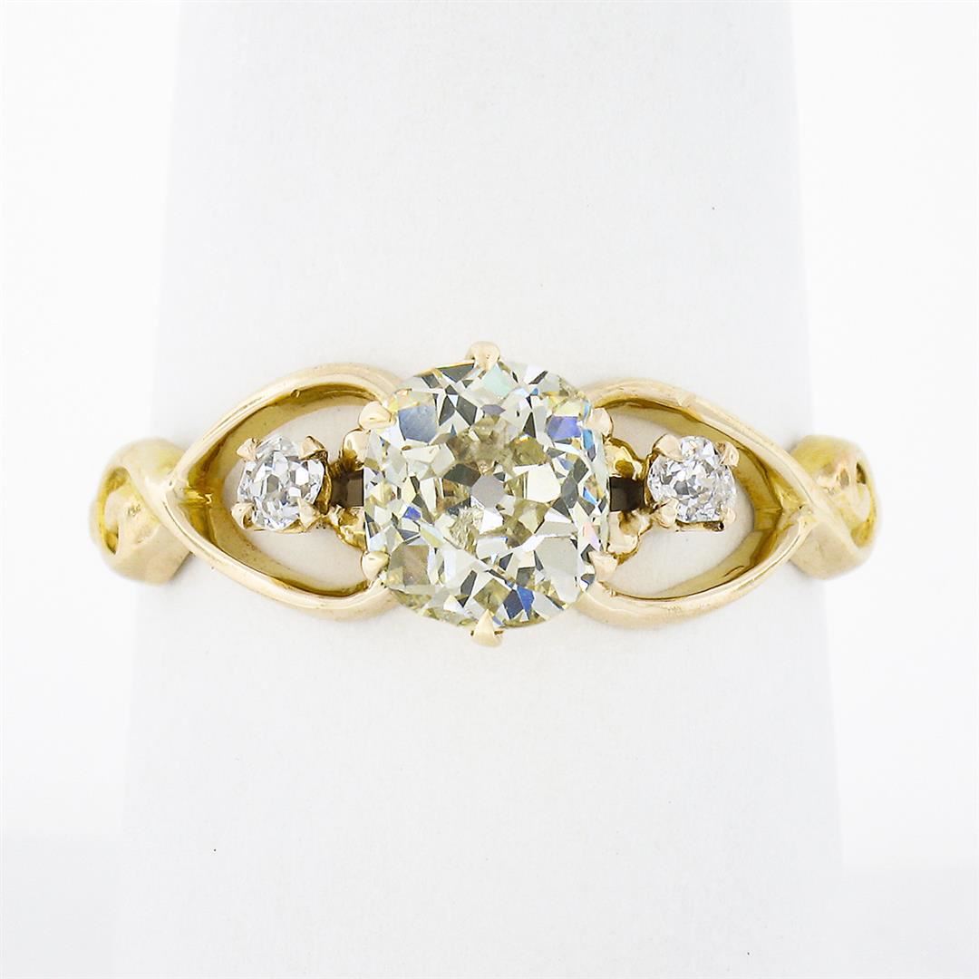 An antique solid 10k yellow gold engagement ring, with 1 old mine cut natural diamond (O/P - SI1 ; 1.29ct), accented with 2 old mine cut natural diamonds (G/H - VS2/SI1 ; 0.10ctw). The ring is size 8.5, weighs a total of 2.40 grams, and measures 7.90mm wide.