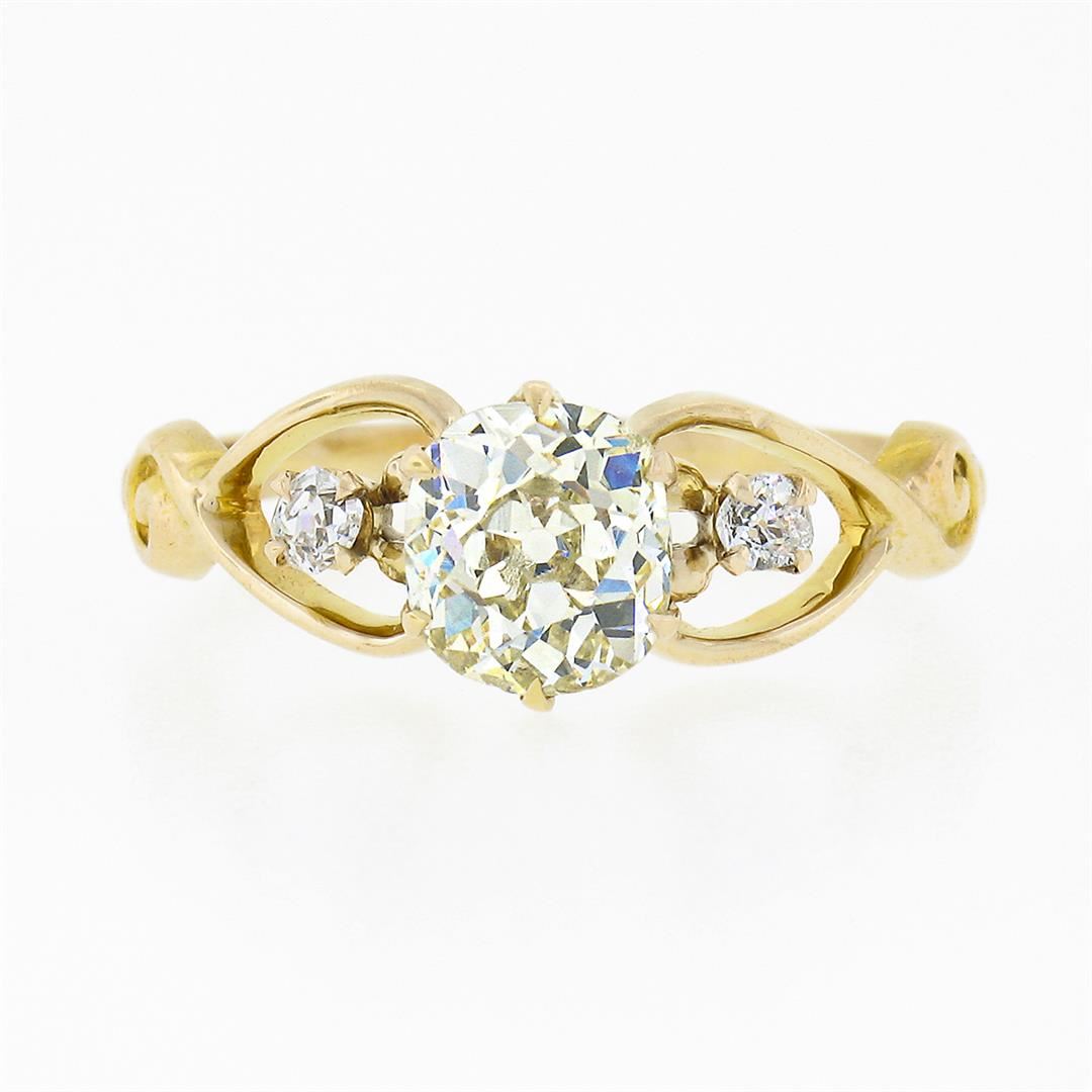 An antique solid 10k yellow gold engagement ring, with 1 old mine cut natural diamond (O/P - SI1 ; 1.29ct), accented with 2 old mine cut natural diamonds (G/H - VS2/SI1 ; 0.10ctw). The ring is size 8.5, weighs a total of 2.40 grams, and measures 7.90mm wide.