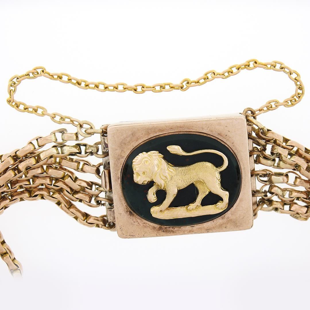 An antique solid 10k yellow gold bracelet. with 1 oval cut natural bloodstone (19.25x15.8mm). It weighs a total of 19.86 grams, measures 17.9mm wide, and measures 7 inches in length.