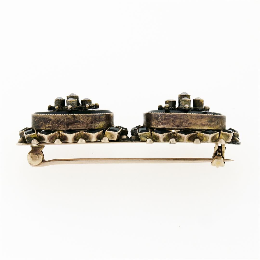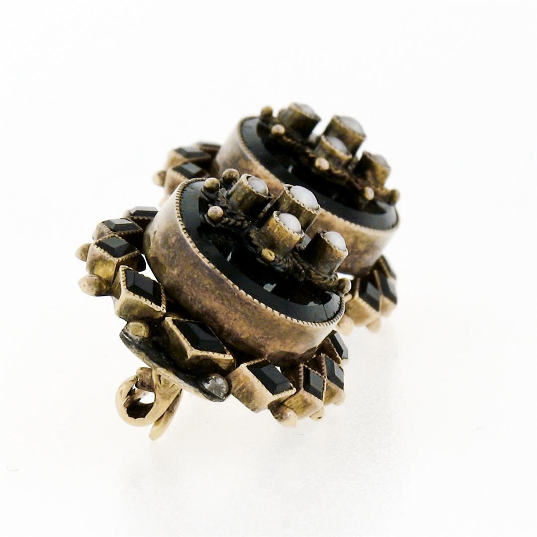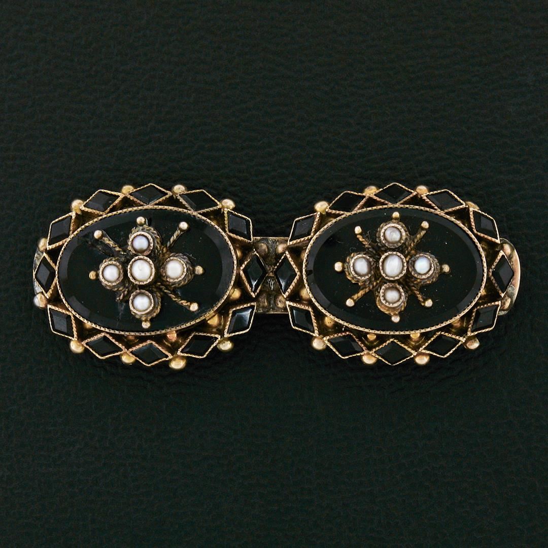An antique solid 10k rose gold pin brooch, with oval cut natural balck jet (7.65x5.25mm), 24 custom diamond cut natural black jet (1.60x1.10mm), and 10 round shape natural seed pearls (0.75mm - 0.90mm). Measures 21.40x8mm and weighs a total of 8.76 grams.