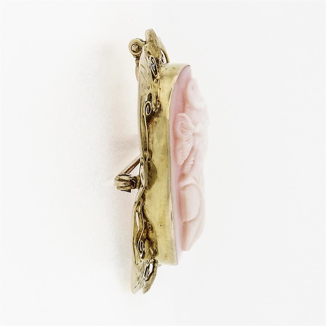 An antique victorian solid 10k yellow gold pin brooch pendant, with1 oval shape carved cameo shell (29.40x22.33mm). Measures 39.06mx32.92mm and weighs a total of 7.45 grams.
