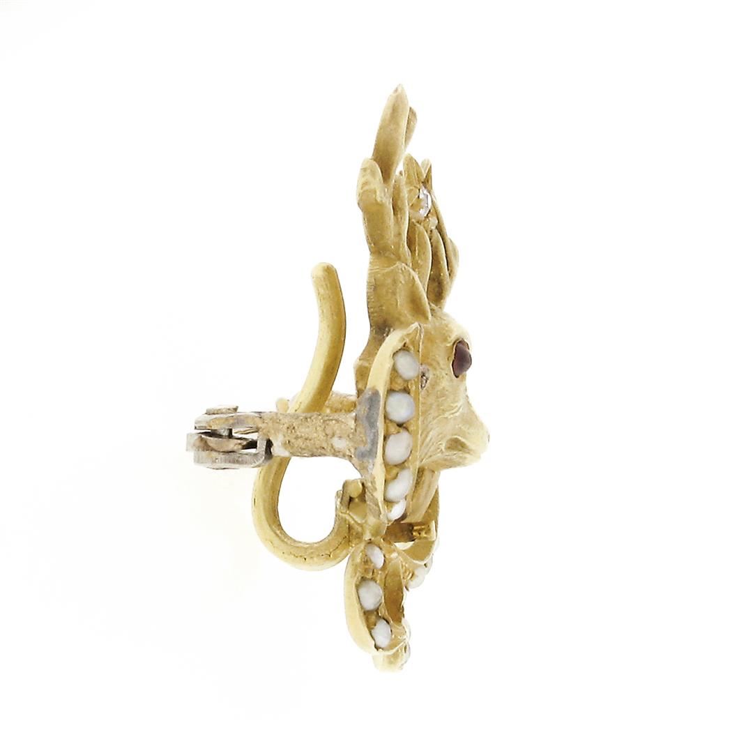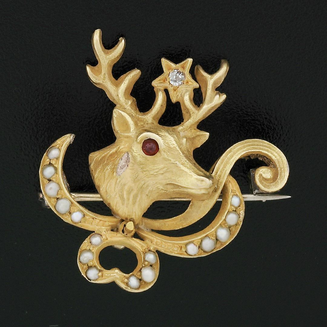 An antique victorian solid 10k yellow gold elk pin brooch, with 1 old mine cut natural diamond (G - VS1 ; 0.03ctw ), & 1 round cabochon cut natural ruby (0.03ctw ), with 16 bead shape natural seed pearls (1.2-1.6mm). Measures 22.0x22.1mm and weighs a total of 2.45 grams.