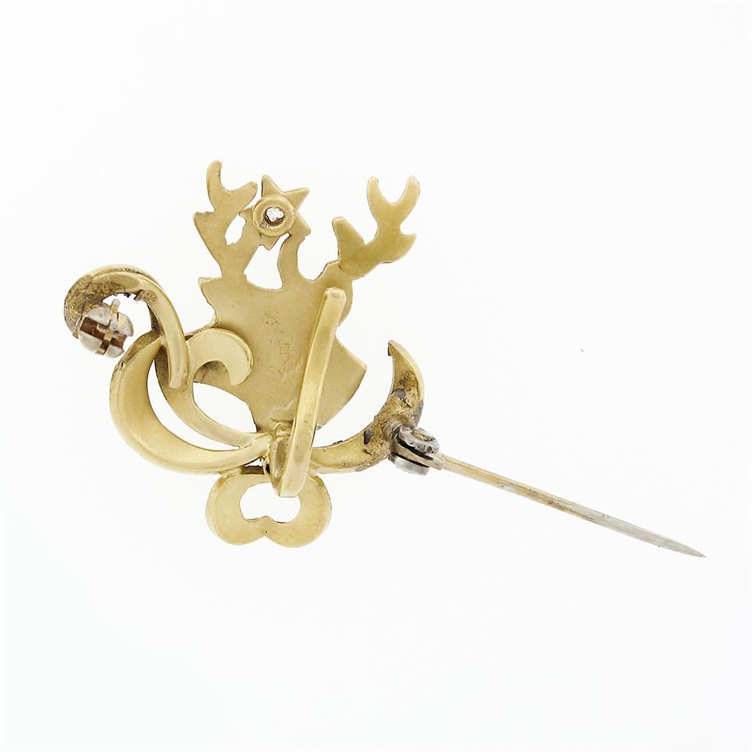 An antique victorian solid 10k yellow gold elk pin brooch, with 1 old mine cut natural diamond (G - VS1 ; 0.03ctw ), & 1 round cabochon cut natural ruby (0.03ctw ), with 16 bead shape natural seed pearls (1.2-1.6mm). Measures 22.0x22.1mm and weighs a total of 2.45 grams.