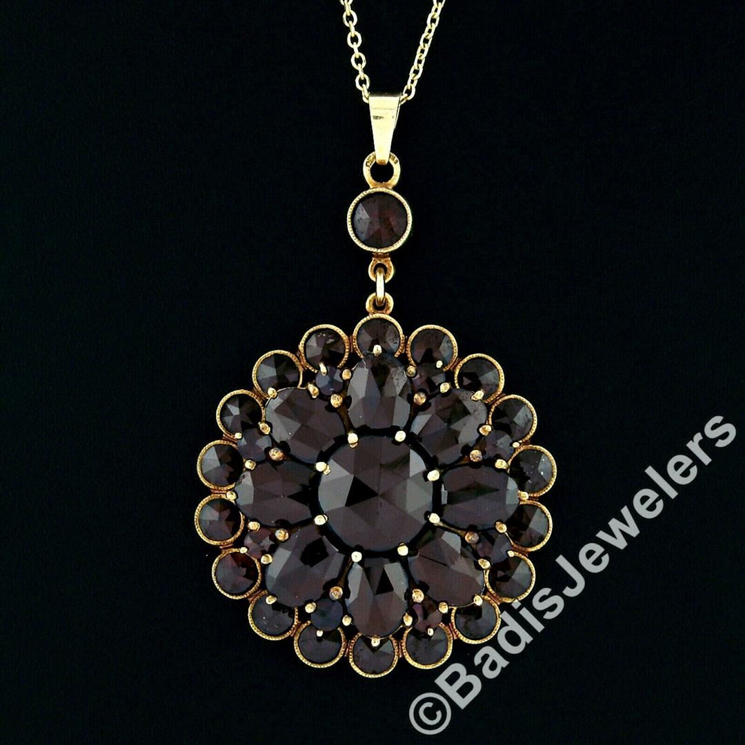 An antique solid 10k yellow gold pendant and 14k yellow gold chain, with 36 round and oval cut natural garnets (15.97). The pendant weighs a total of 10.76 grams, measures 48.24x29.45mm including the bail, and 20 inch fine cable link chain.