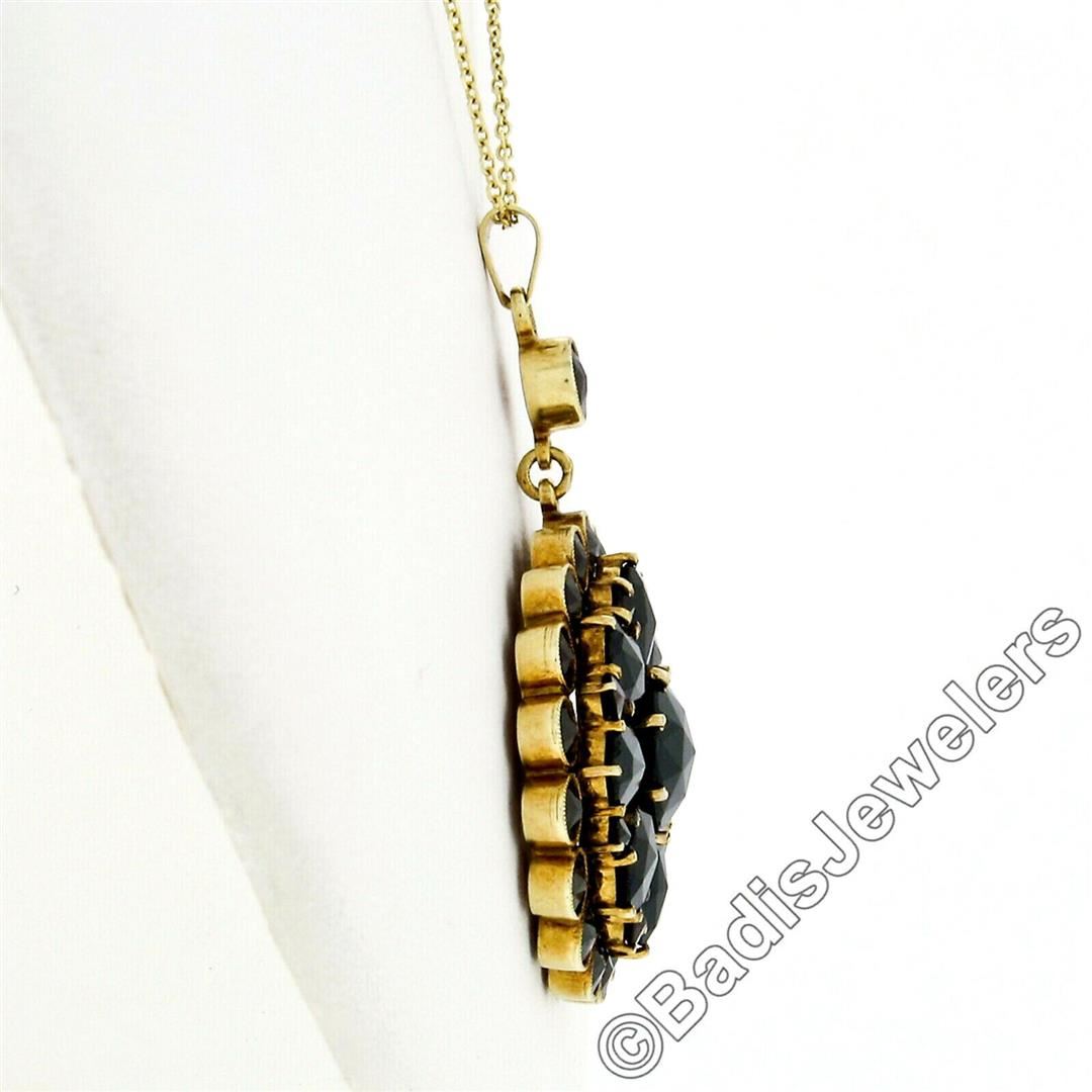 An antique solid 10k yellow gold pendant and 14k yellow gold chain, with 36 round and oval cut natural garnets (15.97). The pendant weighs a total of 10.76 grams, measures 48.24x29.45mm including the bail, and 20 inch fine cable link chain.