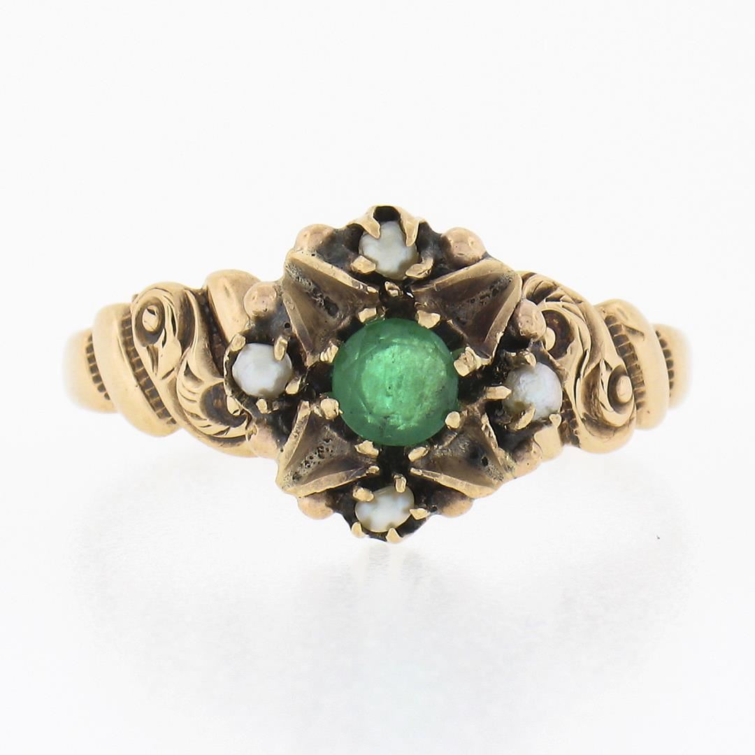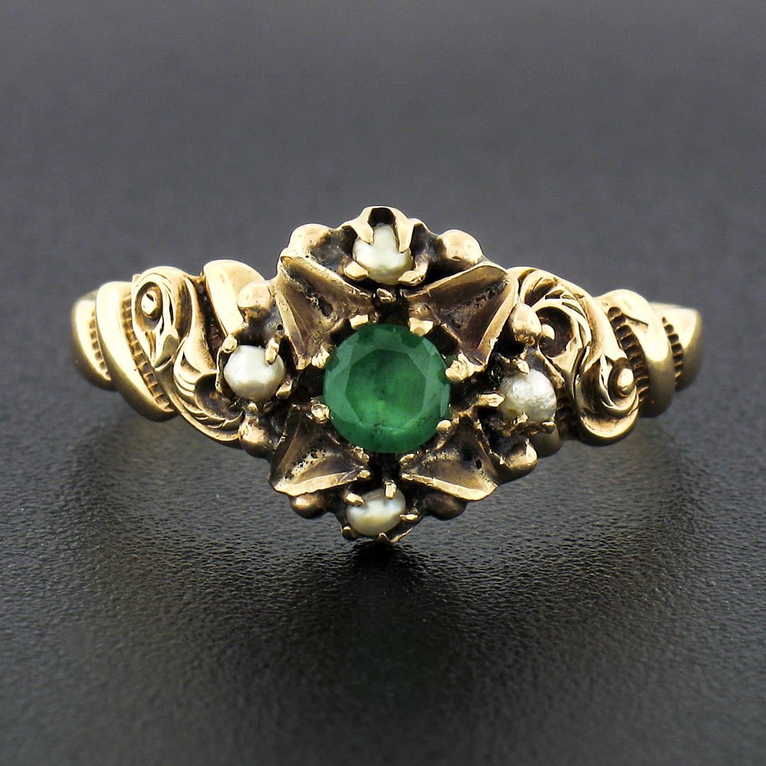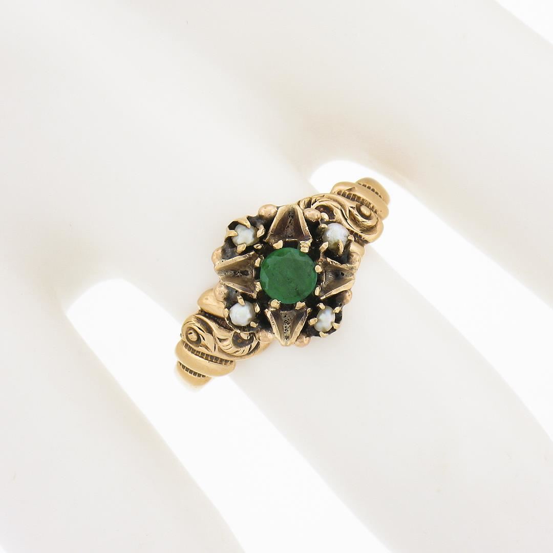An antique solid 10k rosy yellow gold ring. with 1 round cut natural emerald (3.9mm / 0.27ct ), and 4 round shape cultured seed pearls (1.8mm each ). The ring is size 8.0, weighs a total of 2.10 grams, and measures 10.4mm wide.