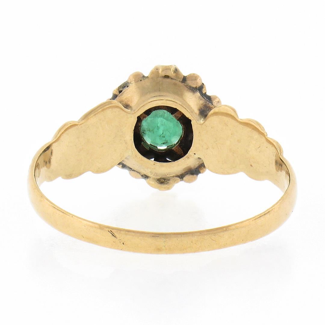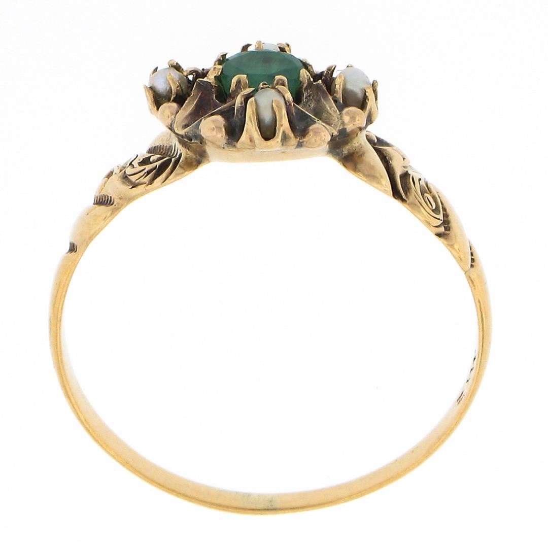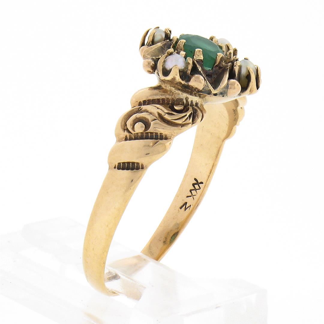 An antique solid 10k rosy yellow gold ring. with 1 round cut natural emerald (3.9mm / 0.27ct ), and 4 round shape cultured seed pearls (1.8mm each ). The ring is size 8.0, weighs a total of 2.10 grams, and measures 10.4mm wide.