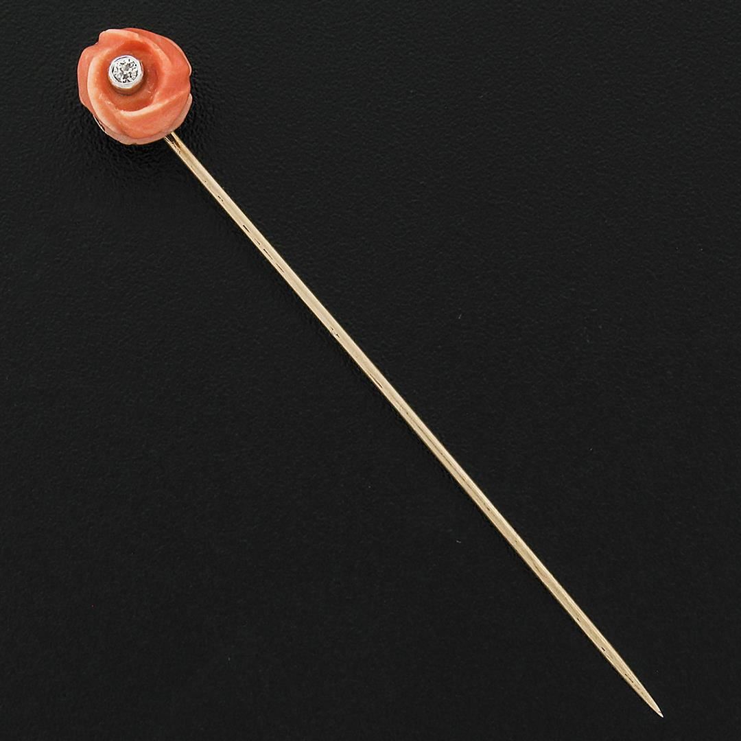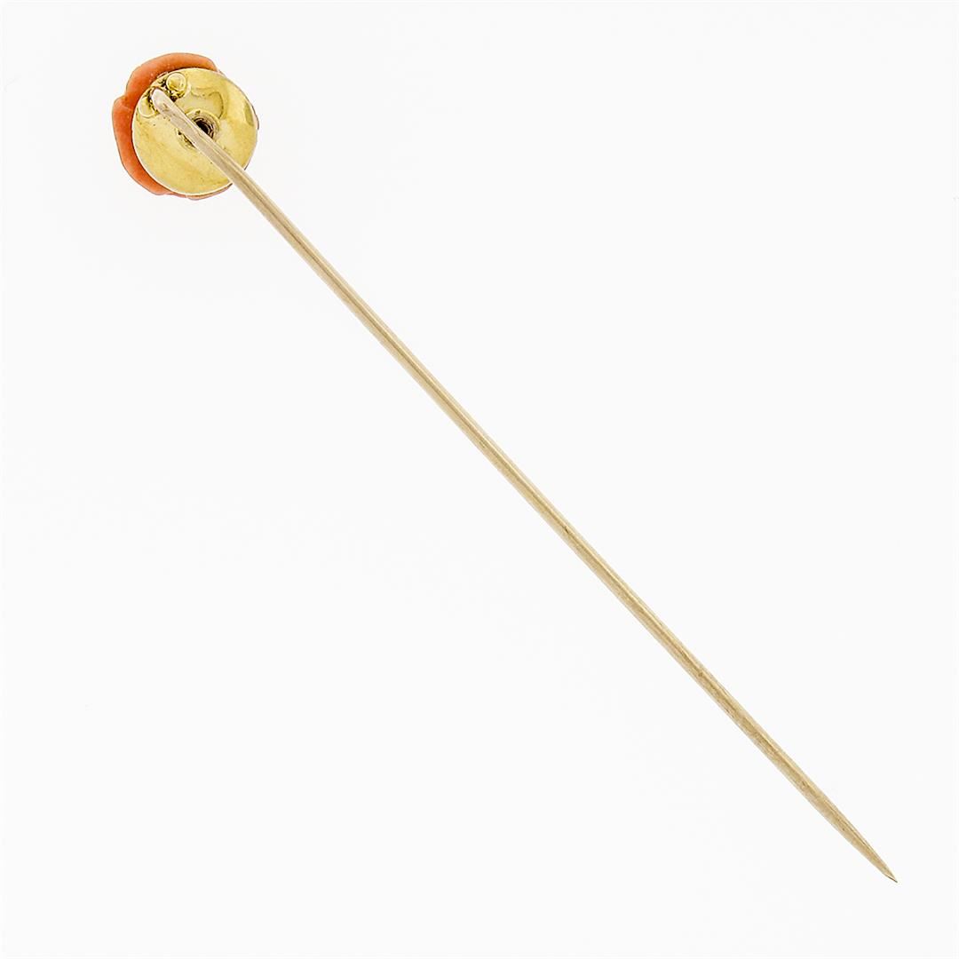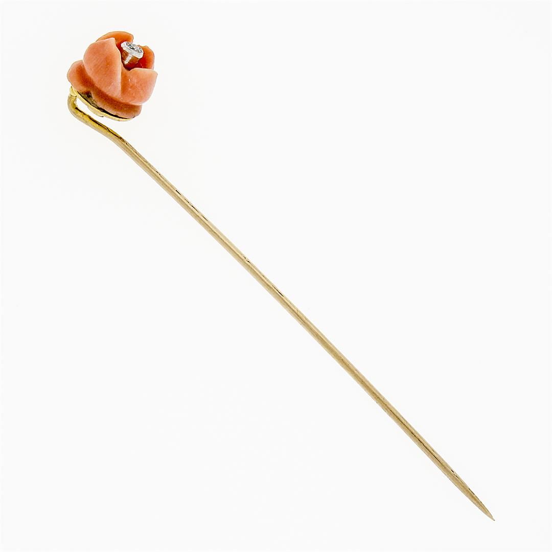 A Victorian solid 10k yellow gold stick pin, with 1 round rose shape natural carved coral (8.04x8.24mm). Measures 64.04x8.24mm and weighs a total of 1.52 grams.