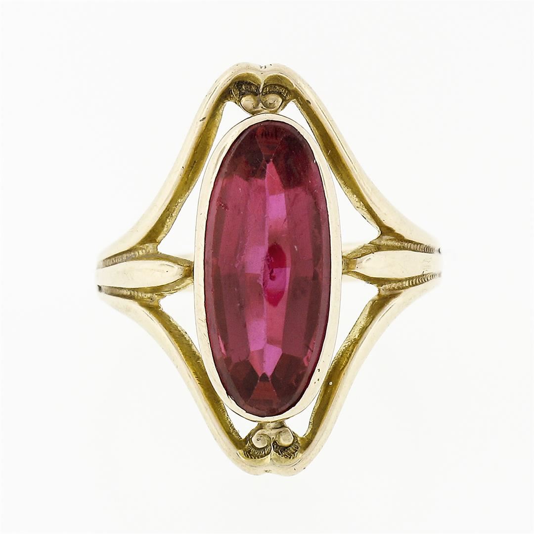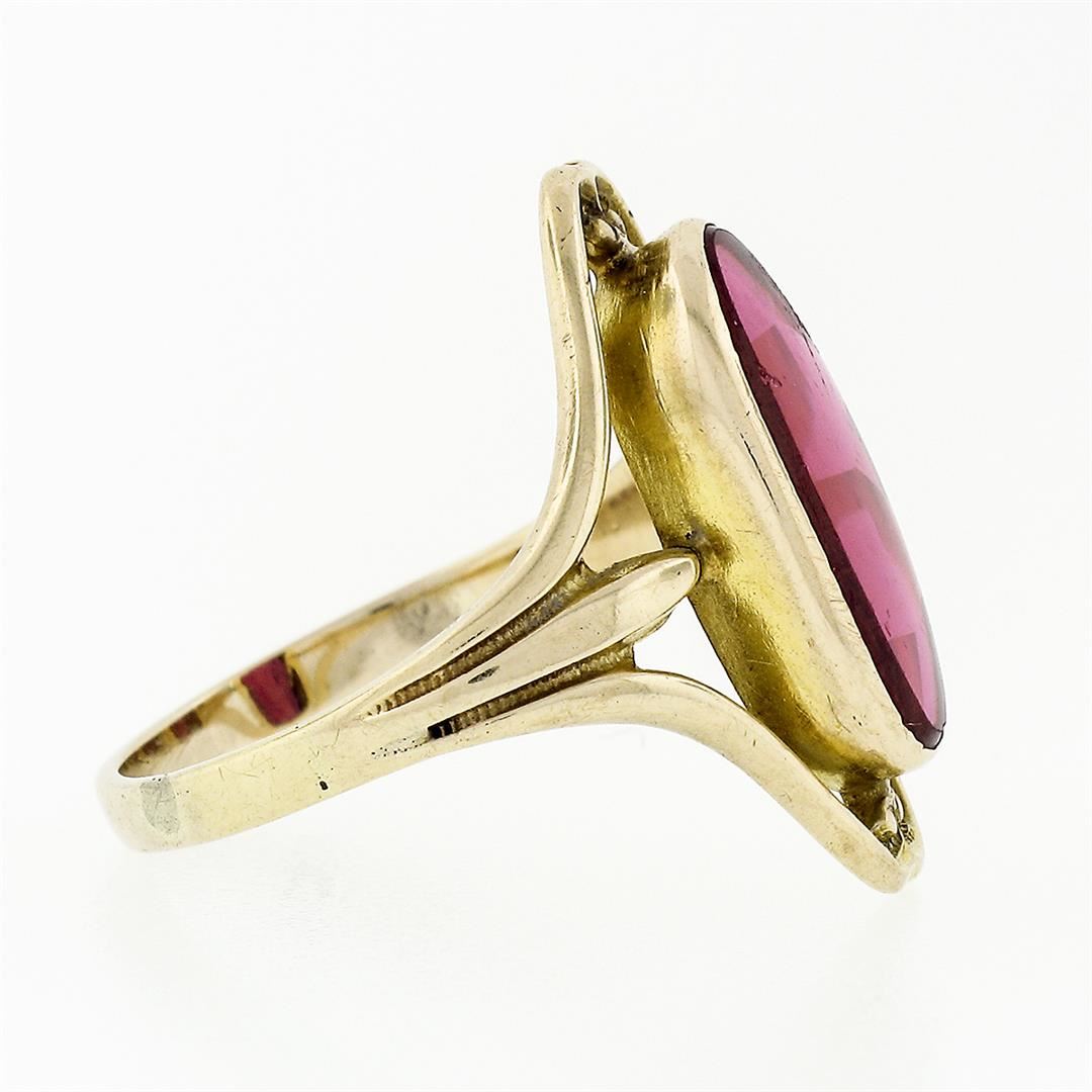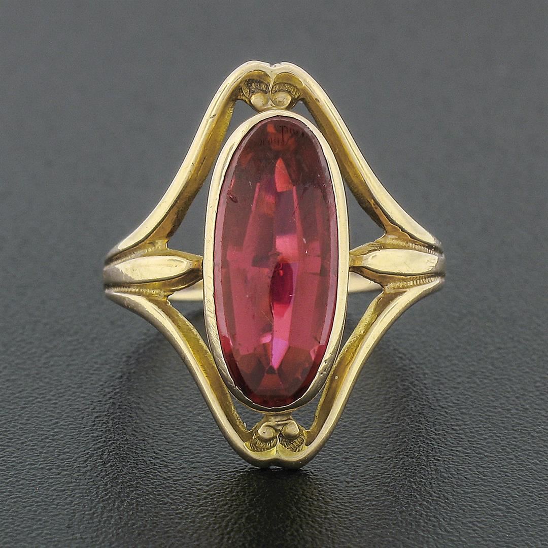 An antique solid 10k yellow gold bypass ring, with 1 round cut red stone (13.78x5.84mm). The ring is size 5.0, weighs a total of 3.16 grams, and measures 19.82mm wide.