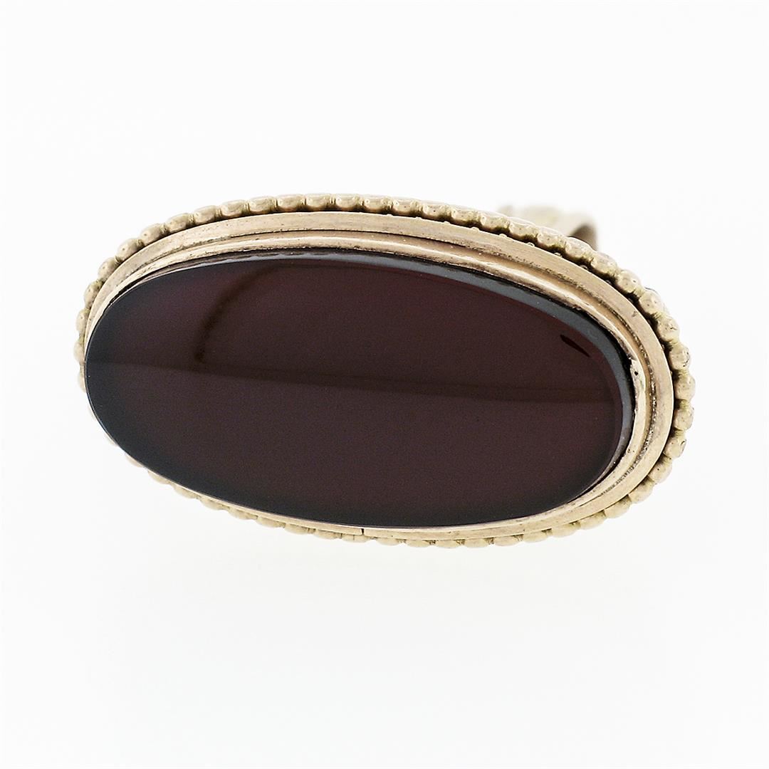 An antique solid 10k yellow gold pendant watch fob, with 1 oval cabochon cut natural carnelian ( 9.79x19.96mm). The pendant weighs a total of 4.94 grams, measures 28.13x23.05mm including the bail, and the inside of the bail measures 3.1x5.1mm.