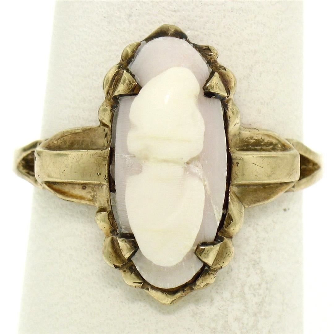 An antique victorian solid 10k yellow gold solitaire ring, with 1 oval cut genuine carved stone cameo . The ring is size 6.5, weighs a total of 3.2 grams, and measures 16.99mm wide.