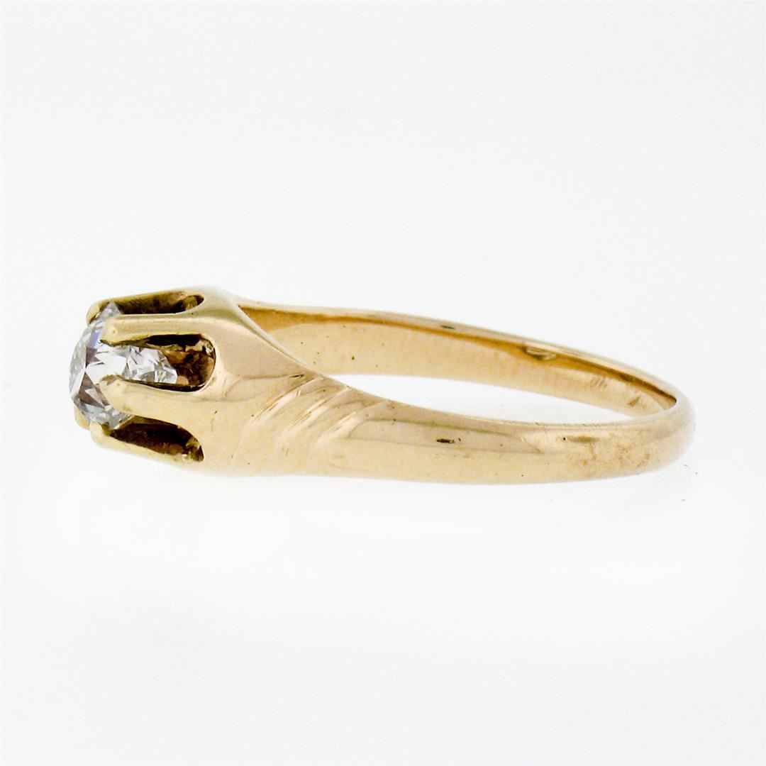 An antique solid 14k yellow gold solitaire belcher ring, with 1 cushion old cut natural diamond (G - VS1; 0.40ct). The ring is size 4.5, weighs a total of 2.08 grams, and measures 6.0mm wide.