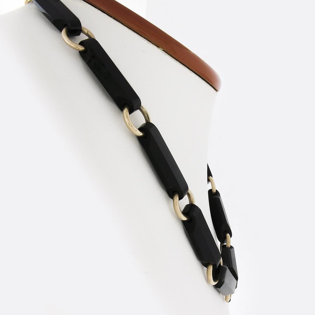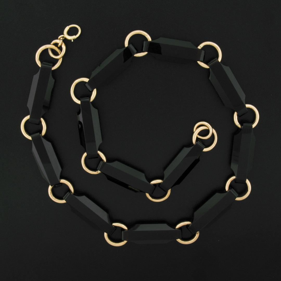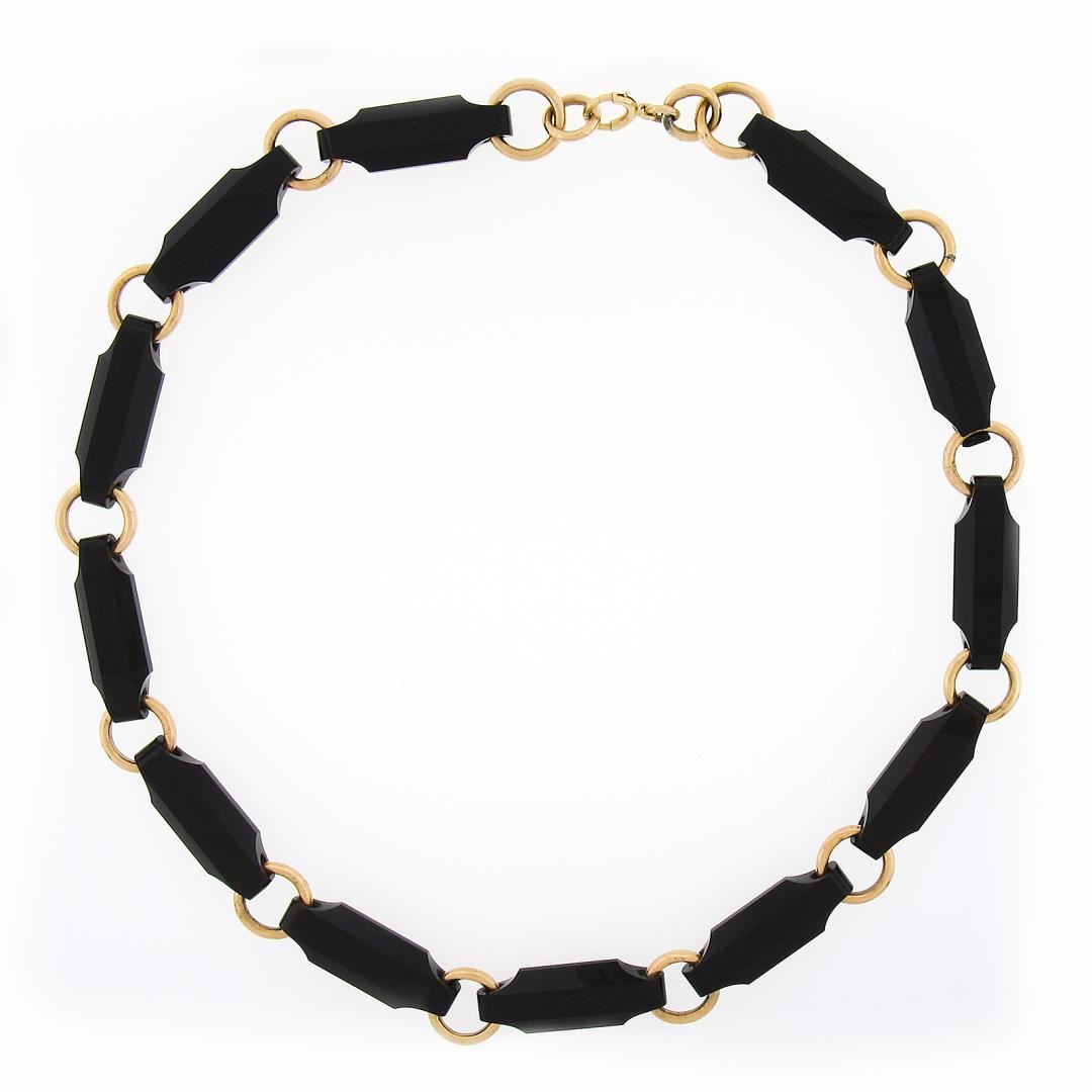 An antique solid 14k yellow gold necklace, with 12 reddish black stones (28.5x10mm). It weighs a total of 37.50 grams, measures 10mm wide, and measures 17 inches in length.