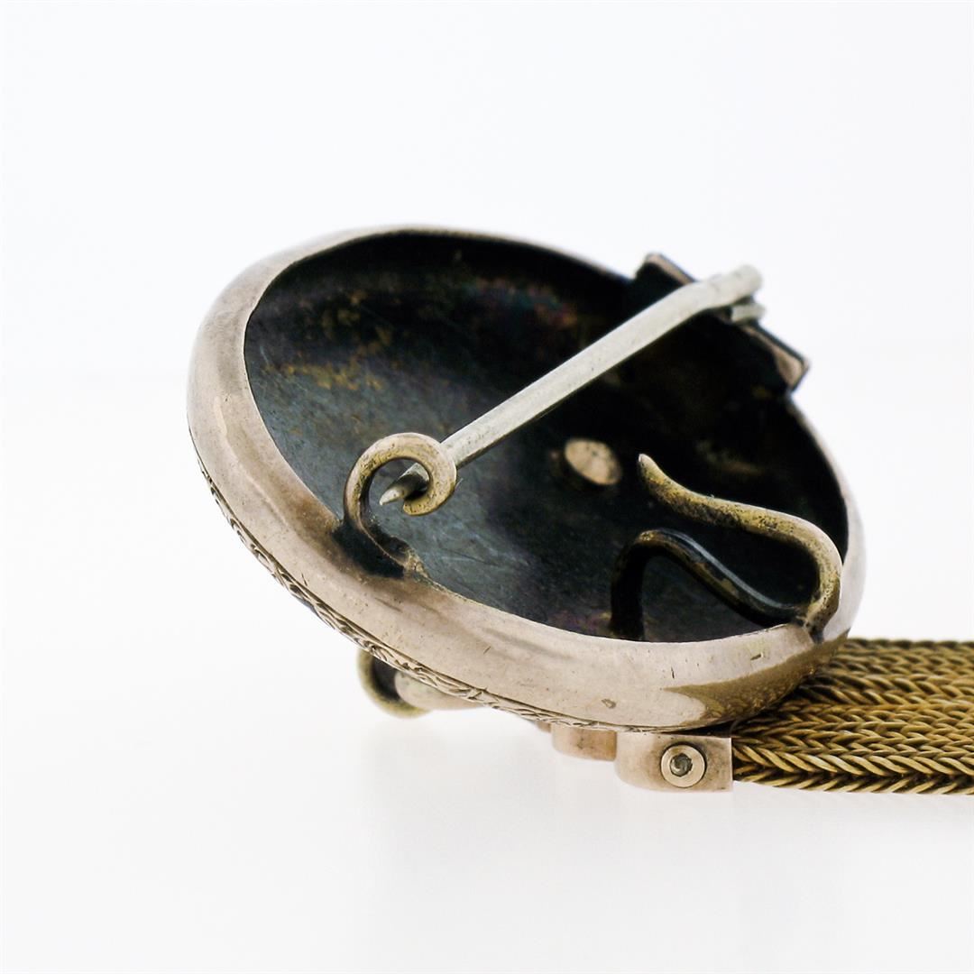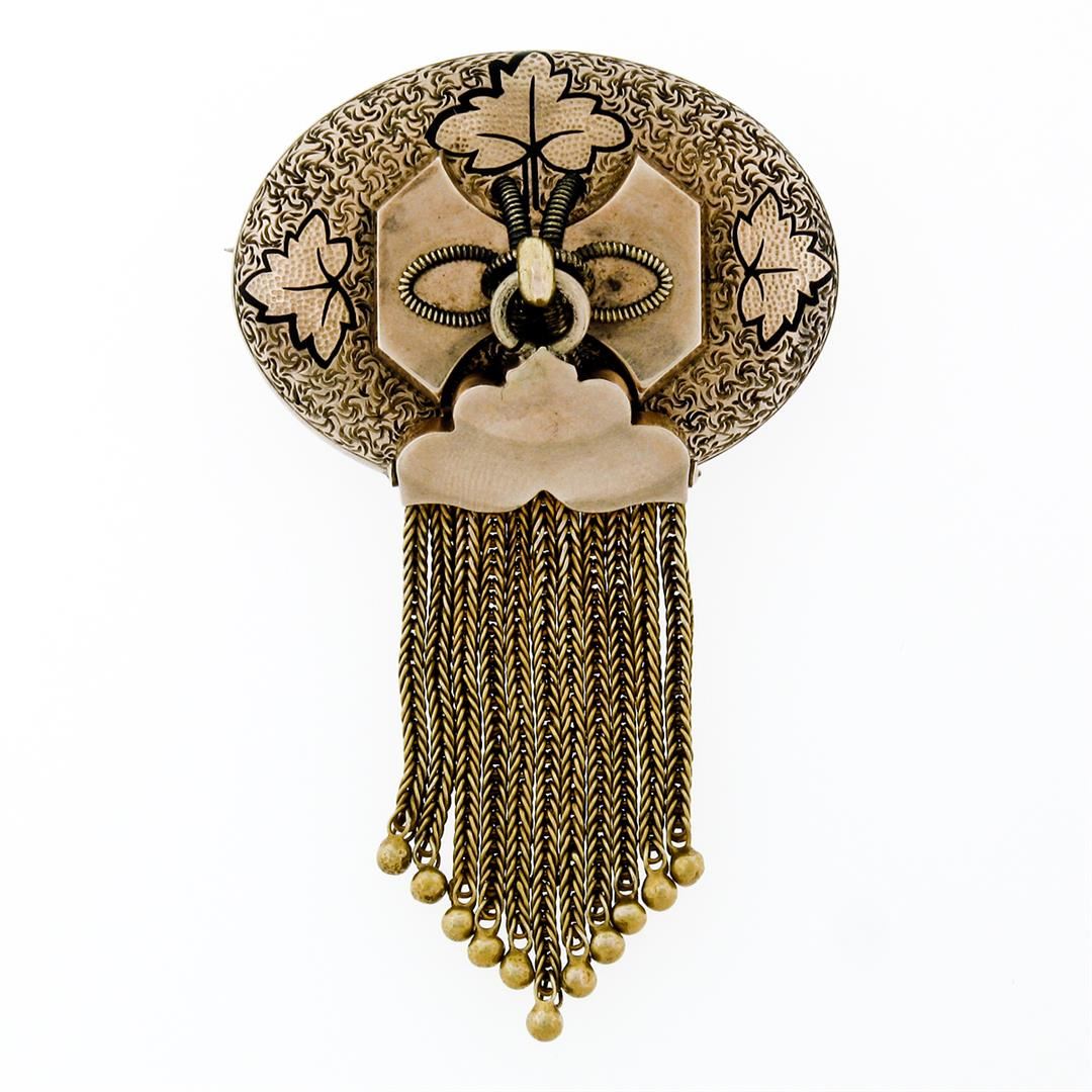An antique victorian 14k yellow gold tassel dangle pin brooch, with black enamel work. Measures 56.0x32.85mm and weighs a total of 9.81 grams.