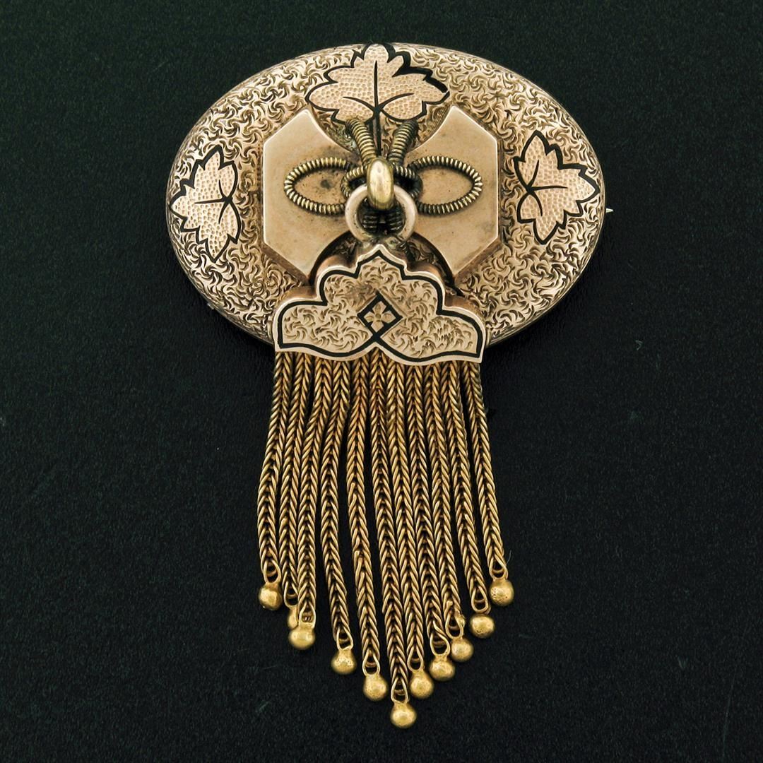 An antique victorian 14k yellow gold tassel dangle pin brooch, with black enamel work. Measures 56.0x32.85mm and weighs a total of 9.81 grams.