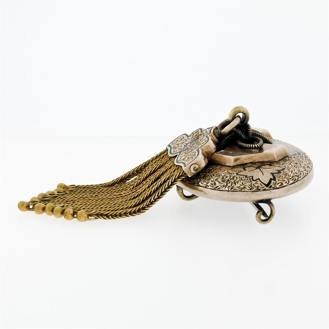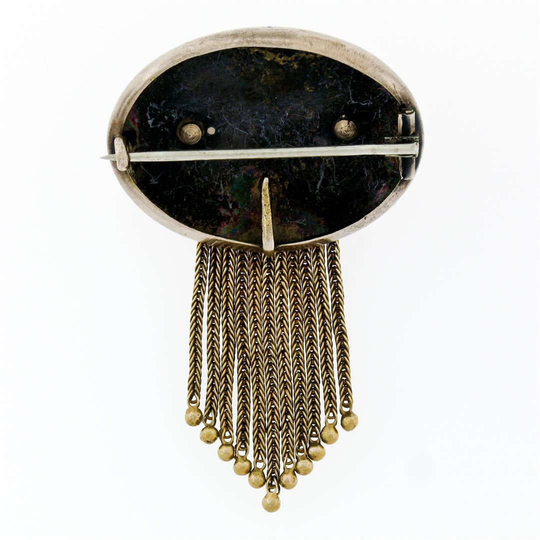 An antique victorian 14k yellow gold tassel dangle pin brooch, with black enamel work. Measures 56.0x32.85mm and weighs a total of 9.81 grams.